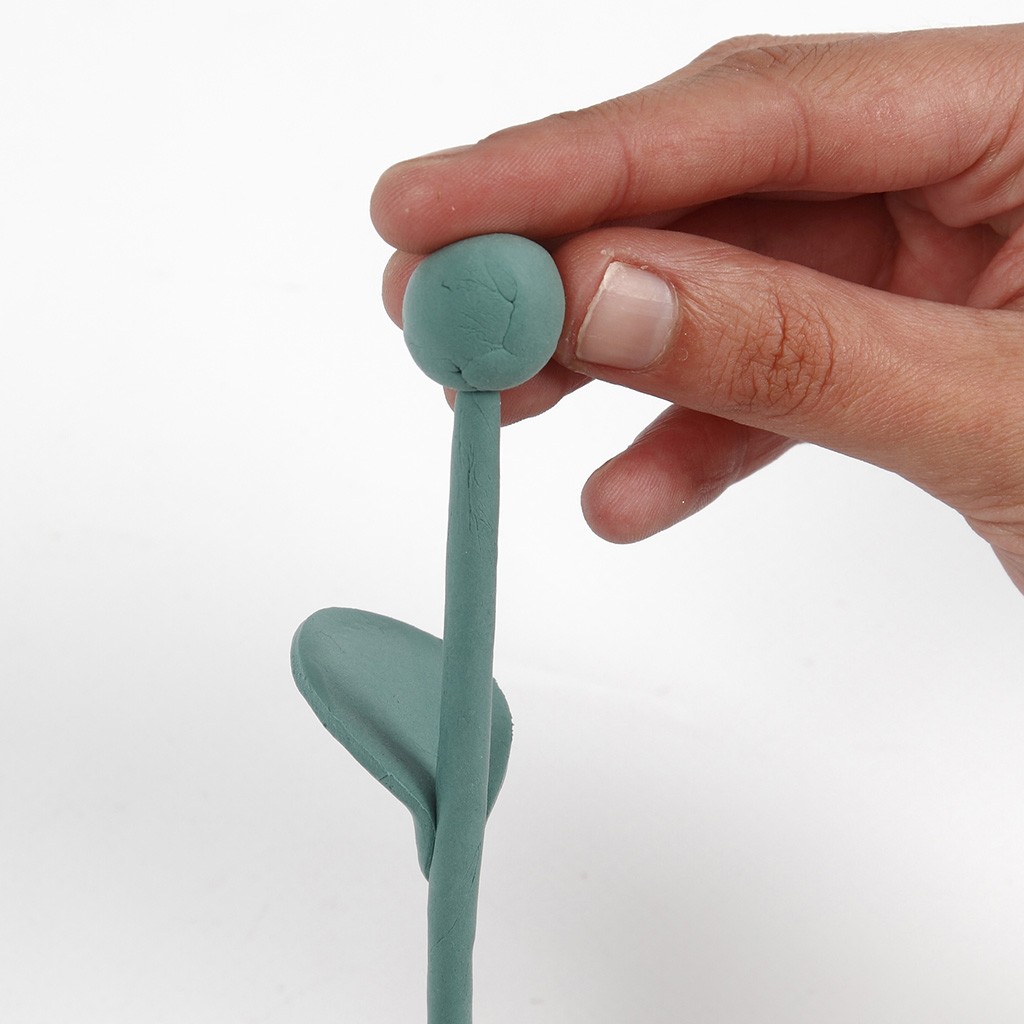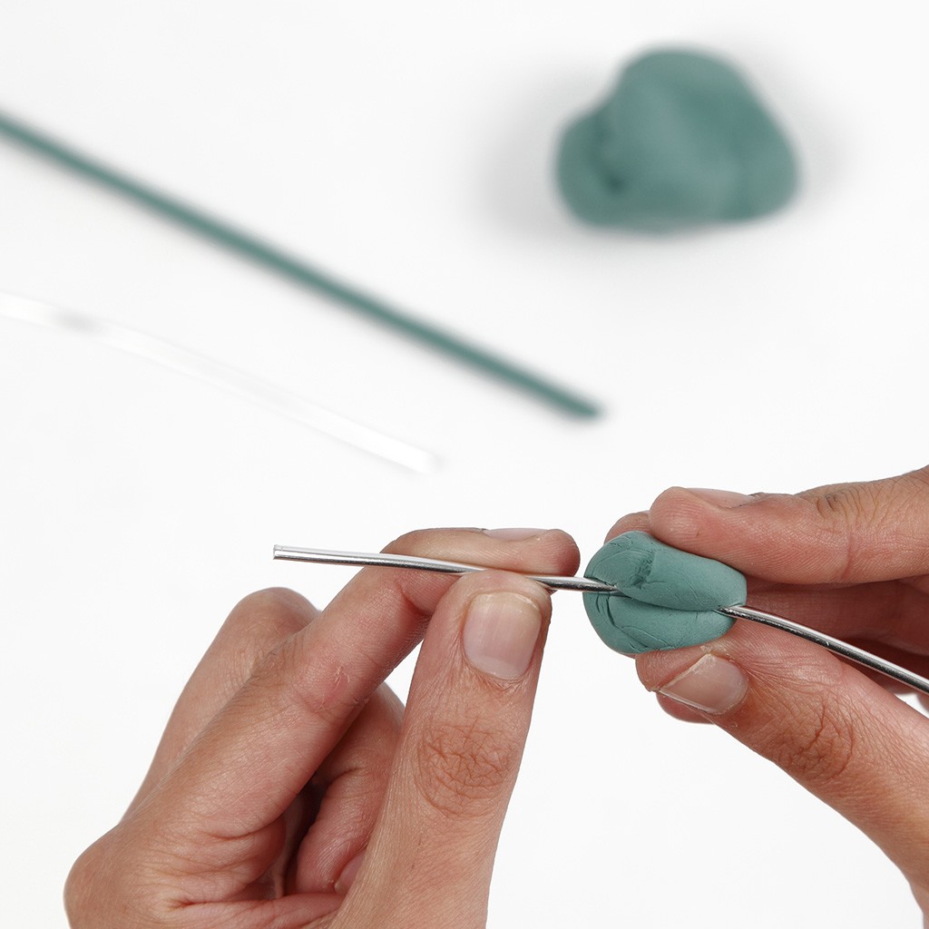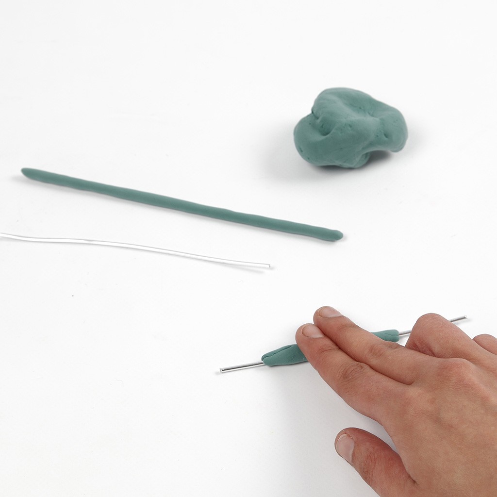 Stap 2, groene silk clay als basis voor de stengel.Bevestig een klein stuk groene Silk Clay rond het midden van een stuk bloemendraad.