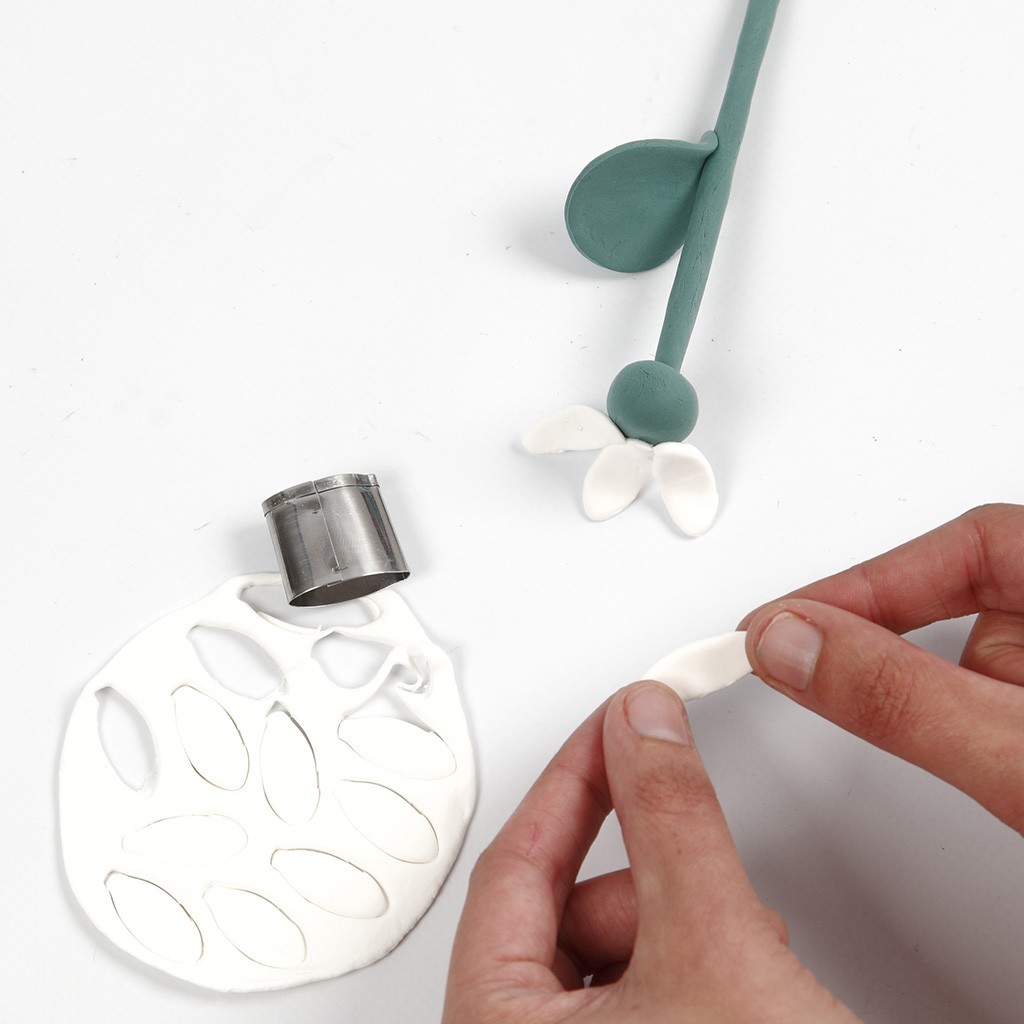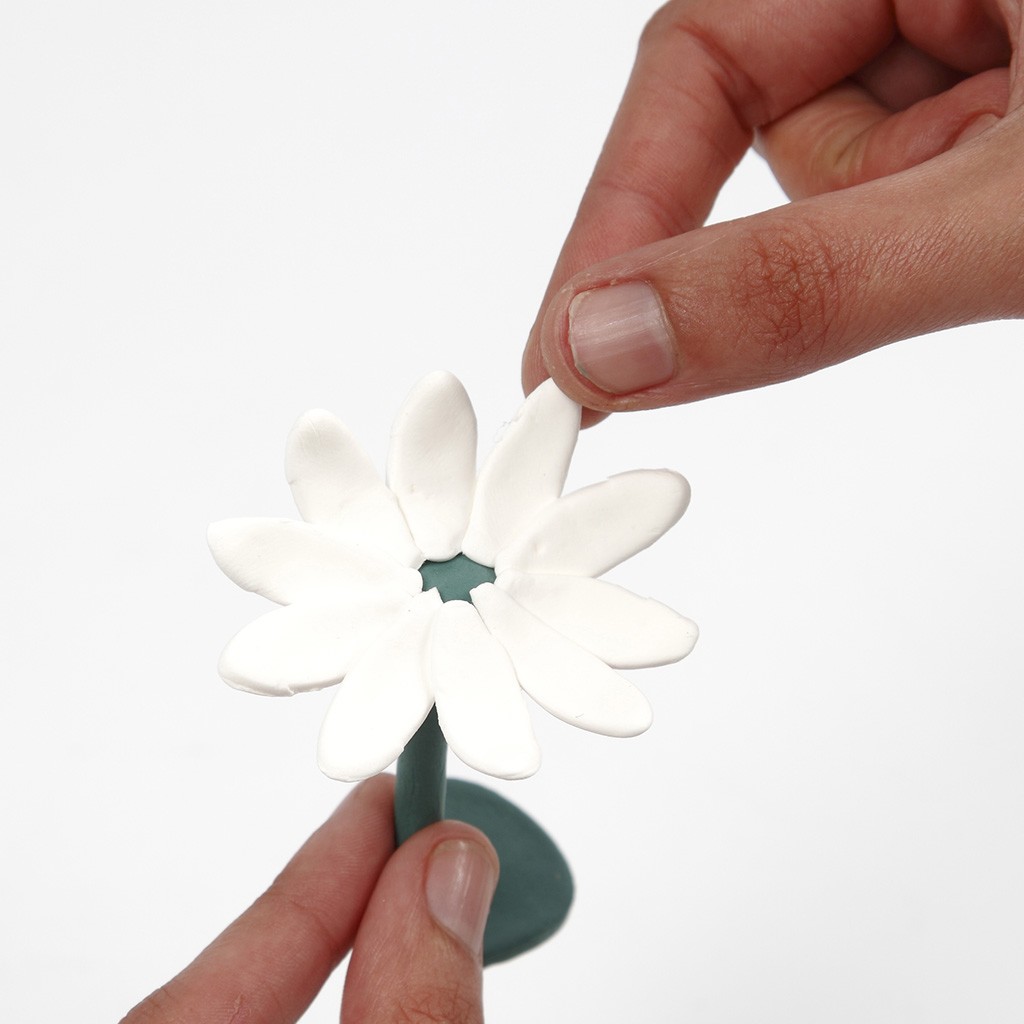 Stap 7, alle bloemblaadjes rond om het hartje van Silk Clay.