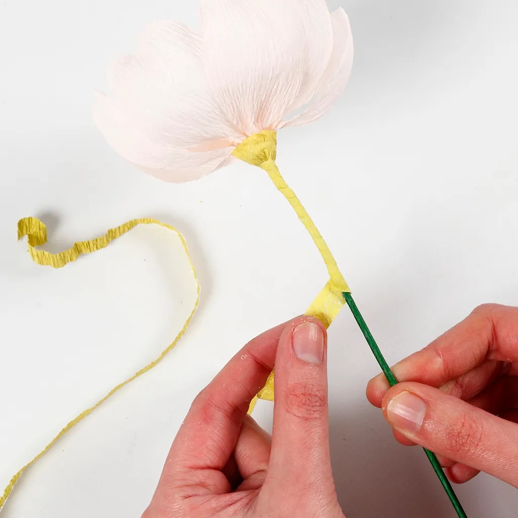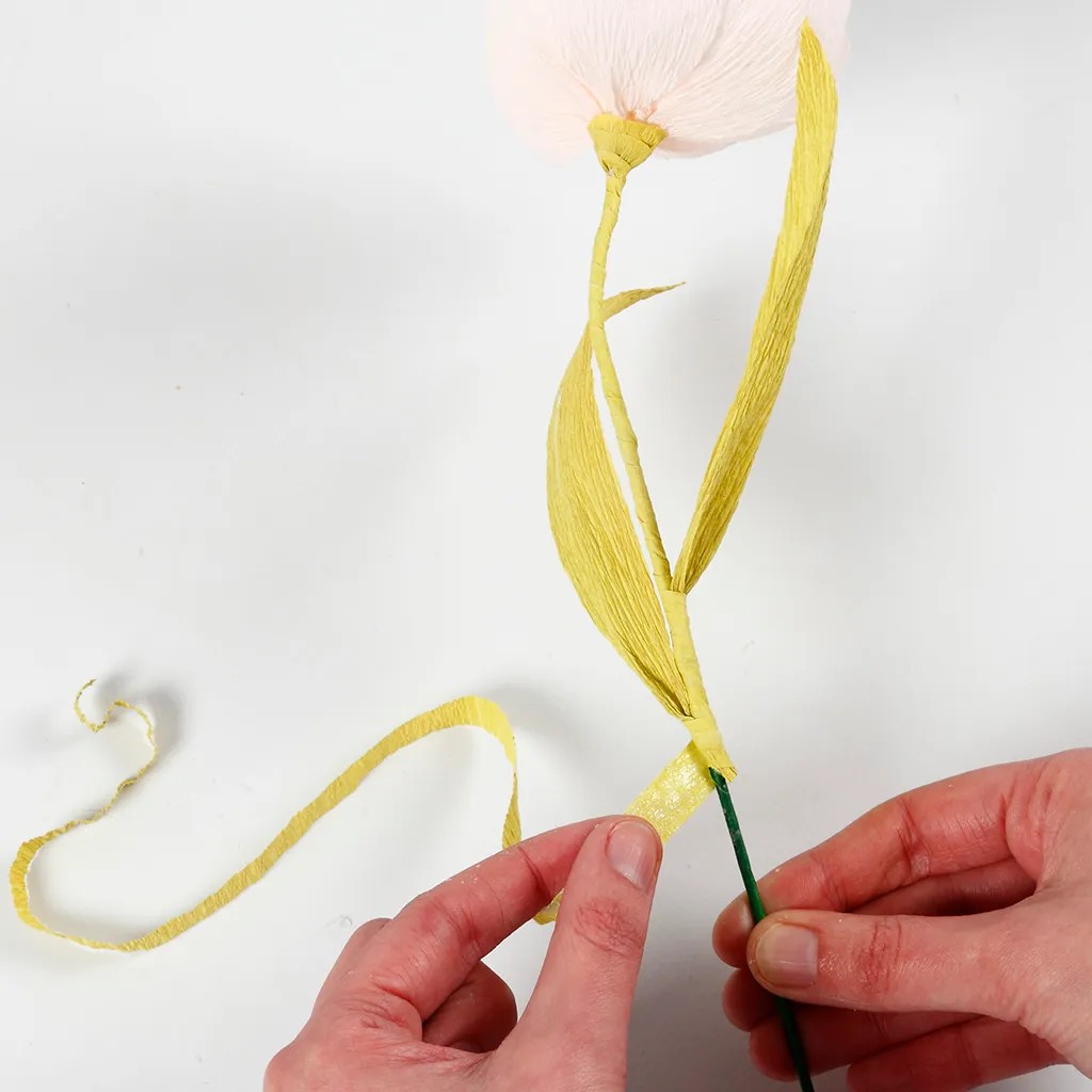 Stap 10Strek het lange dunne stuk groen crêpepapier uit om het bloemsteeldraad te bedekken. Bevestig het ene uiteinde aan het onderste deel van de bladeren. Bedek de bloemensteel door het crêpepapier schuin om het draad te wikkelen en gaandeweg vast te zetten met hobbylijm.