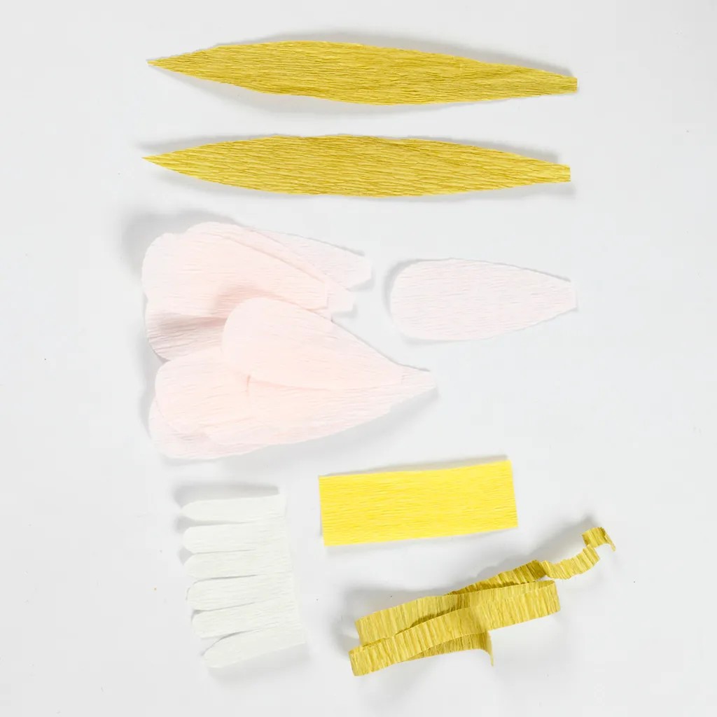 Stap 1Print en knip het sjabloon uit dat onderaan als pdf-bestand beschikbaar is. Knip alle delen voor de bloem uit. Denk eraan om de rekrichting te volgen die op de sjabloon staat aangegeven. Knip een stuk groen crêpepapier van 1 x 20 cm om het bloemsteeldraad te bedekken.