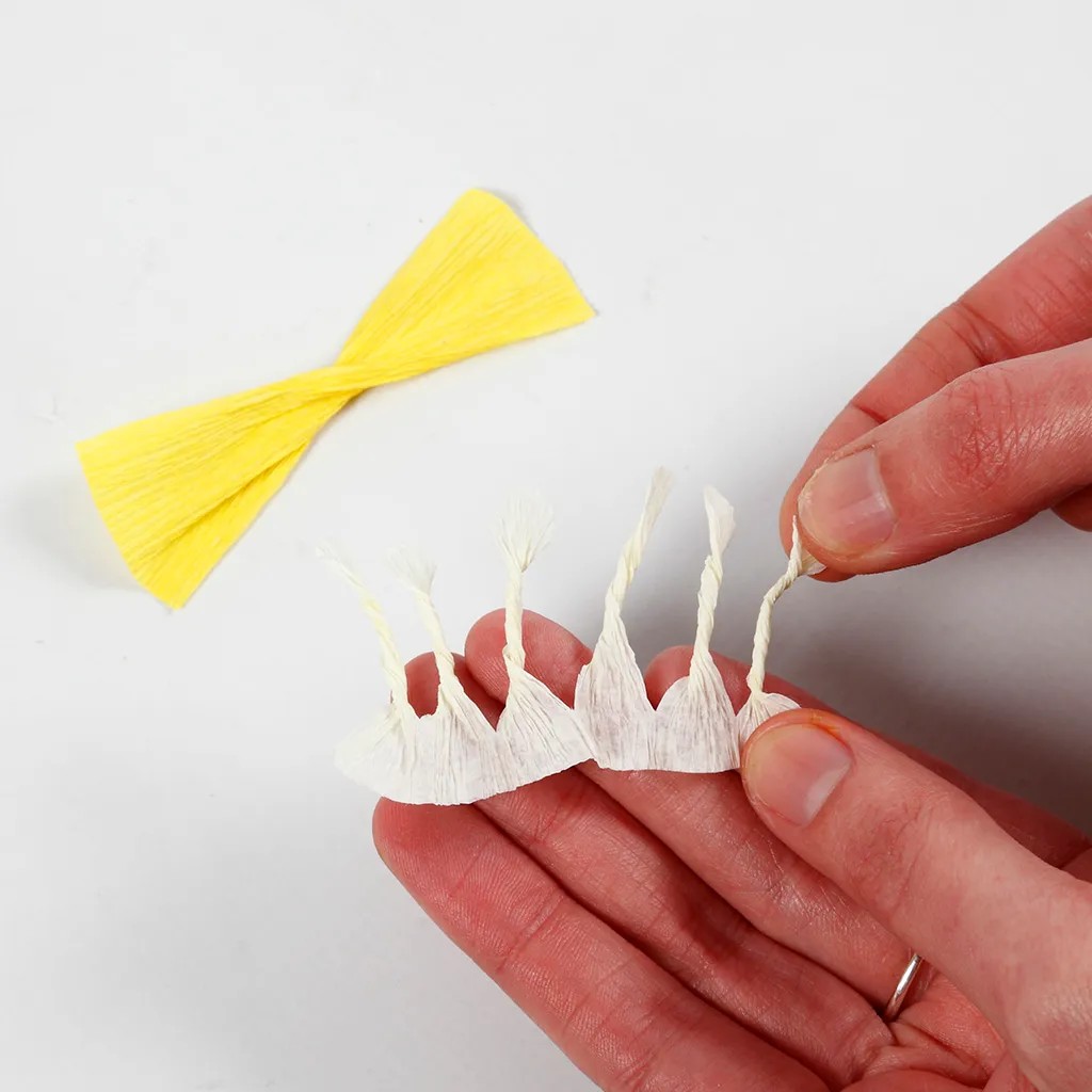 Stap 2Draai het stuk gele crêpepapier dat het midden van de tulp vormt. Draai de toppen voor de meeldraden één voor één zoals weergegeven op het witte stuk crêpepapier op de foto.