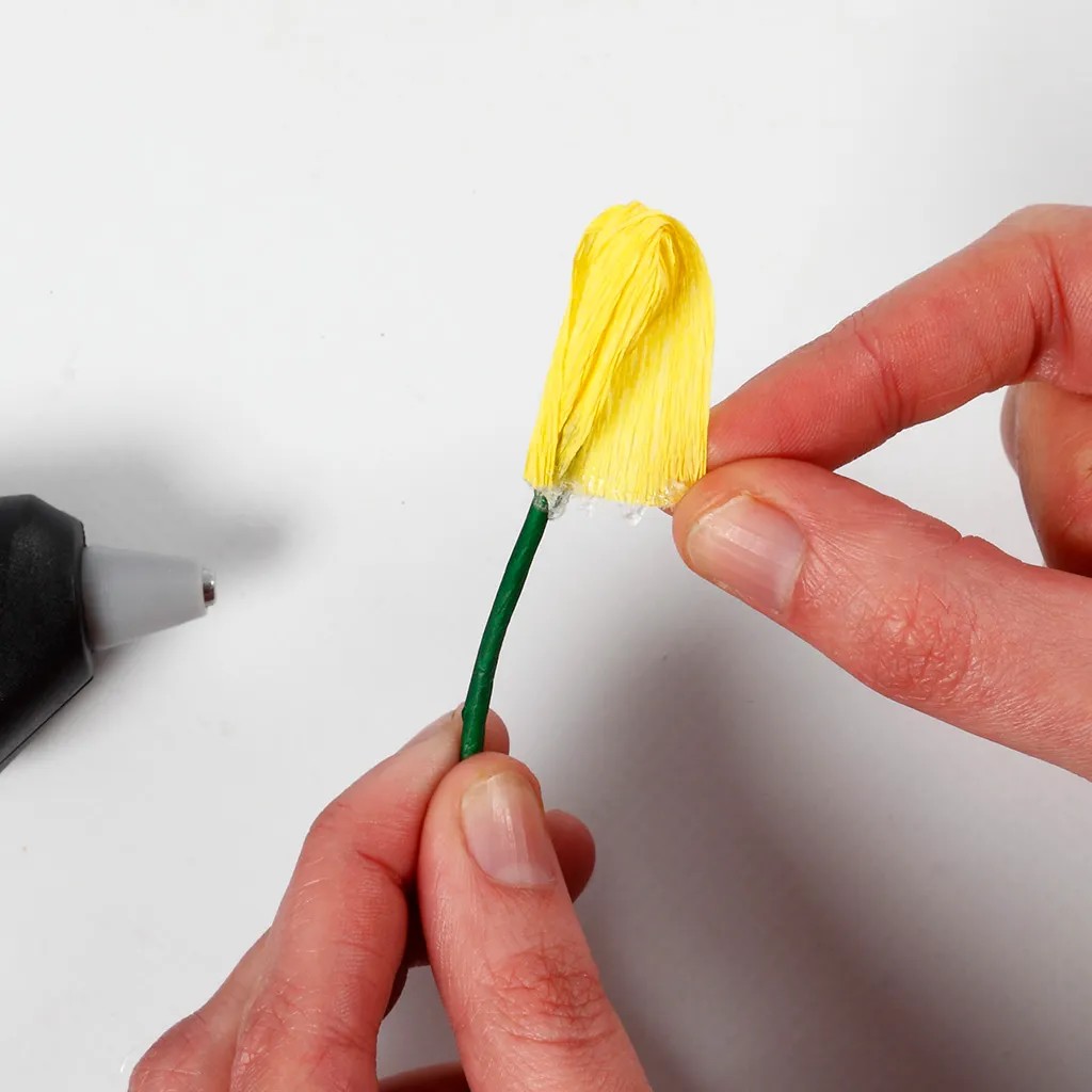 Stap 3Bevestig het gele stuk crêpepapier (het midden van de tulp) aan het ene uiteinde van de bloemensteeldraad; bevestig het ene uiteinde op het bloemensteeldraad en vervolgens het andere uiteinde, zodat het gedraaide middendeel bovenop het bloemensteeldraad komt te liggen.