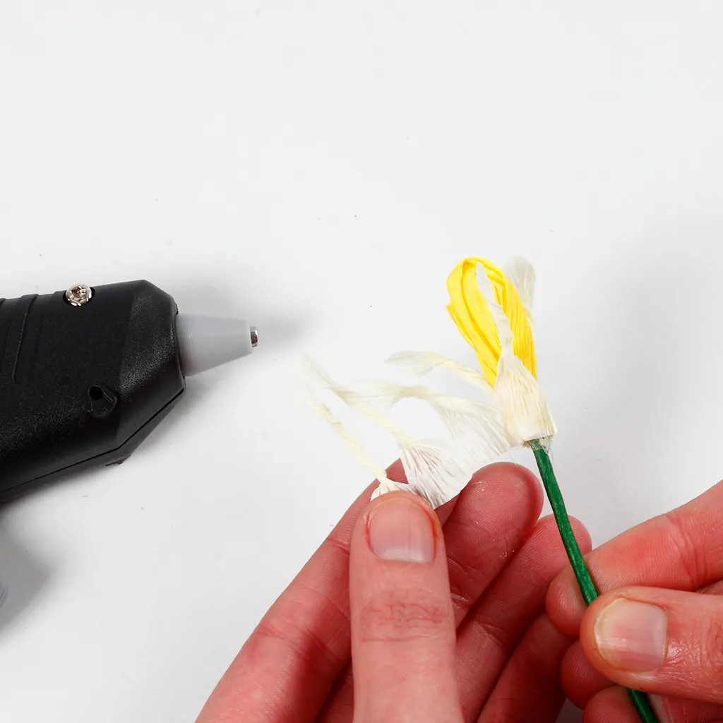 Stap 4Bevestig het gedeelte met de meeldraden rond het onderste deel van het opgeplakte gele crêpepapier met een lijmpistool op lage temperatuur.