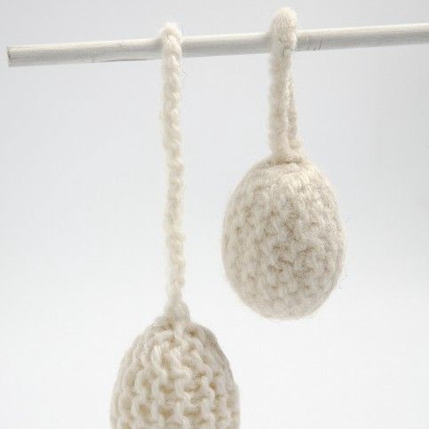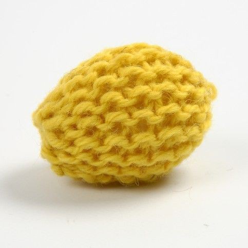 Een gebreid vierkant is een elkaar genaaid tot een tunnel met aan beide kanten een koord. Steek het plastic ei in de tunnel en naai elk uiteinde aan elkaar met het ei aan de binnenkant. Vilt in de wasmachine.