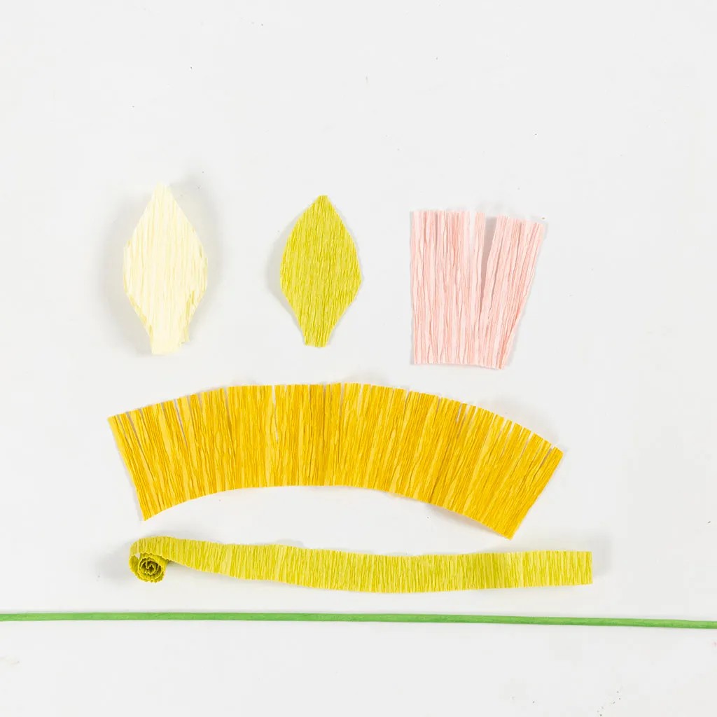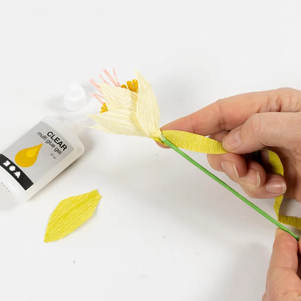 Stap 7Bedek de steel met de lichtgroene strook. Rek de strook uit en plak het uiteinde aan de onderkant van de blaadjes en daarna diagonaal op de bloemsteel. Lijm tot slot een groen blad van 4 cm op de steel.