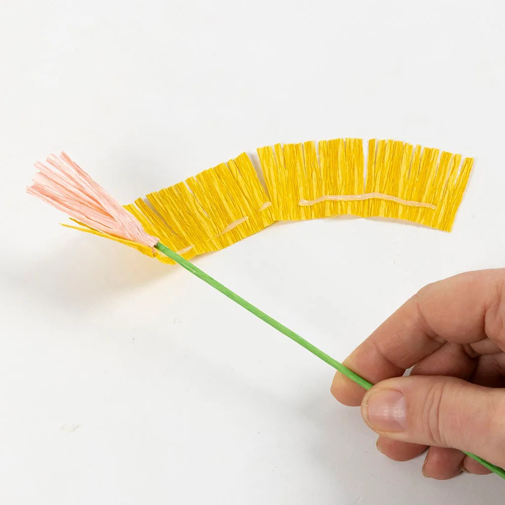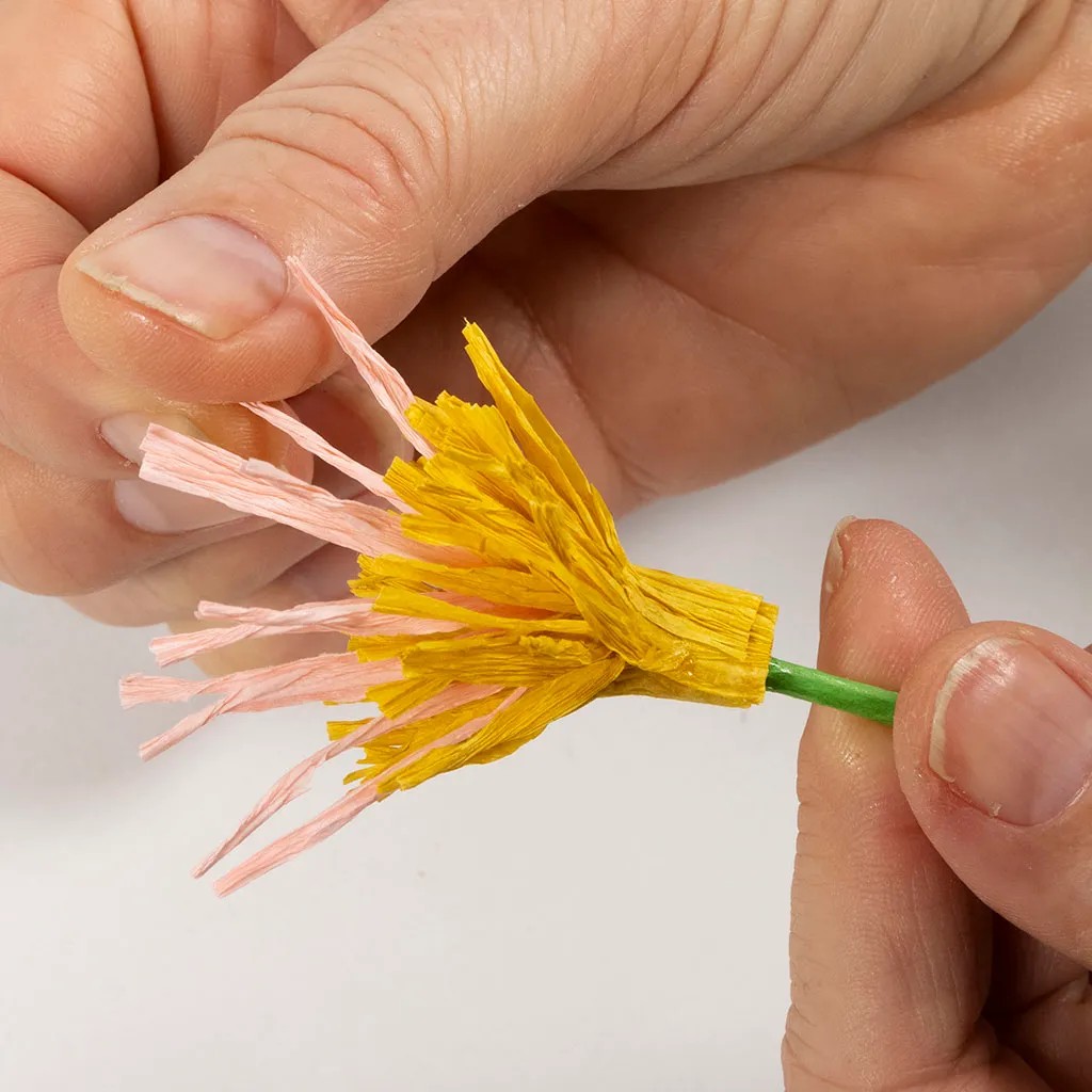 Stap 2Rol de meeldraden tussen twee vingers om de franje rond te maken voor je ze op het bloemstokje plakt.
