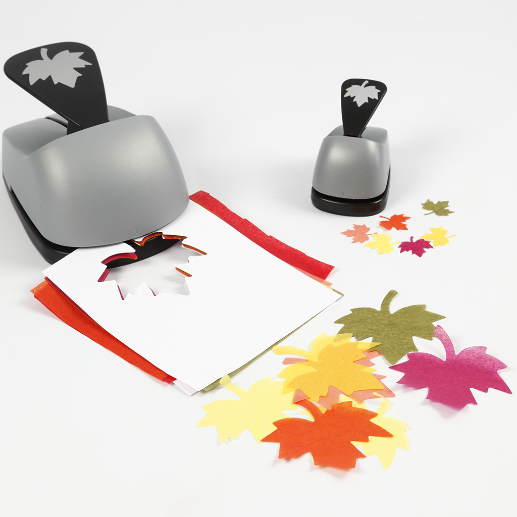 Stap 1Pons bladeren in verschillende formaten uit tissue papier in herfstkleuren. Een tip: om te voorkomen dat het tissue papier vast komt te zitten in de pons, plaatst u 8-10 vellen tissue papier in een gevouwen stuk papier en ponst u het uit.
