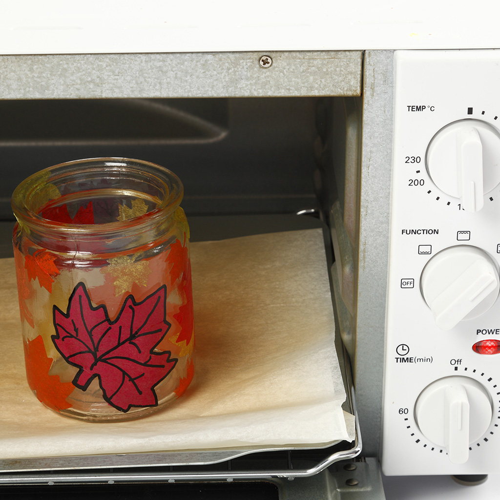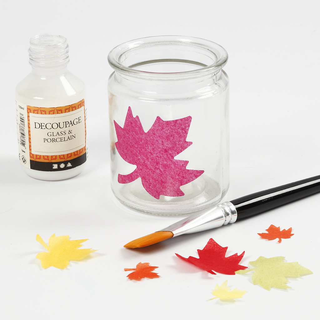 Stap 2Verwijder het metalen handvat van de glazen lantaarn. Was de lantaarn om stof en vet te verwijderen. Breng decoupage lijmlak voor glas en porselein aan op het oppervlak van de glazen lantaarn met een plat penseel. Werk op een klein gebied tegelijk. Breng ook een laag decoupage lijmlak aan op de geplaatste bladeren. Laat drogen tot de volgende dag.