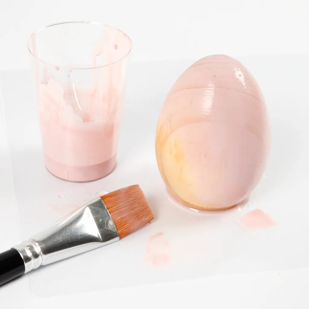 Stap 2Verf het ei. Doordat je de verf een beetje verdunt hebt zal de kleur ook een beetje in het hout trekken.