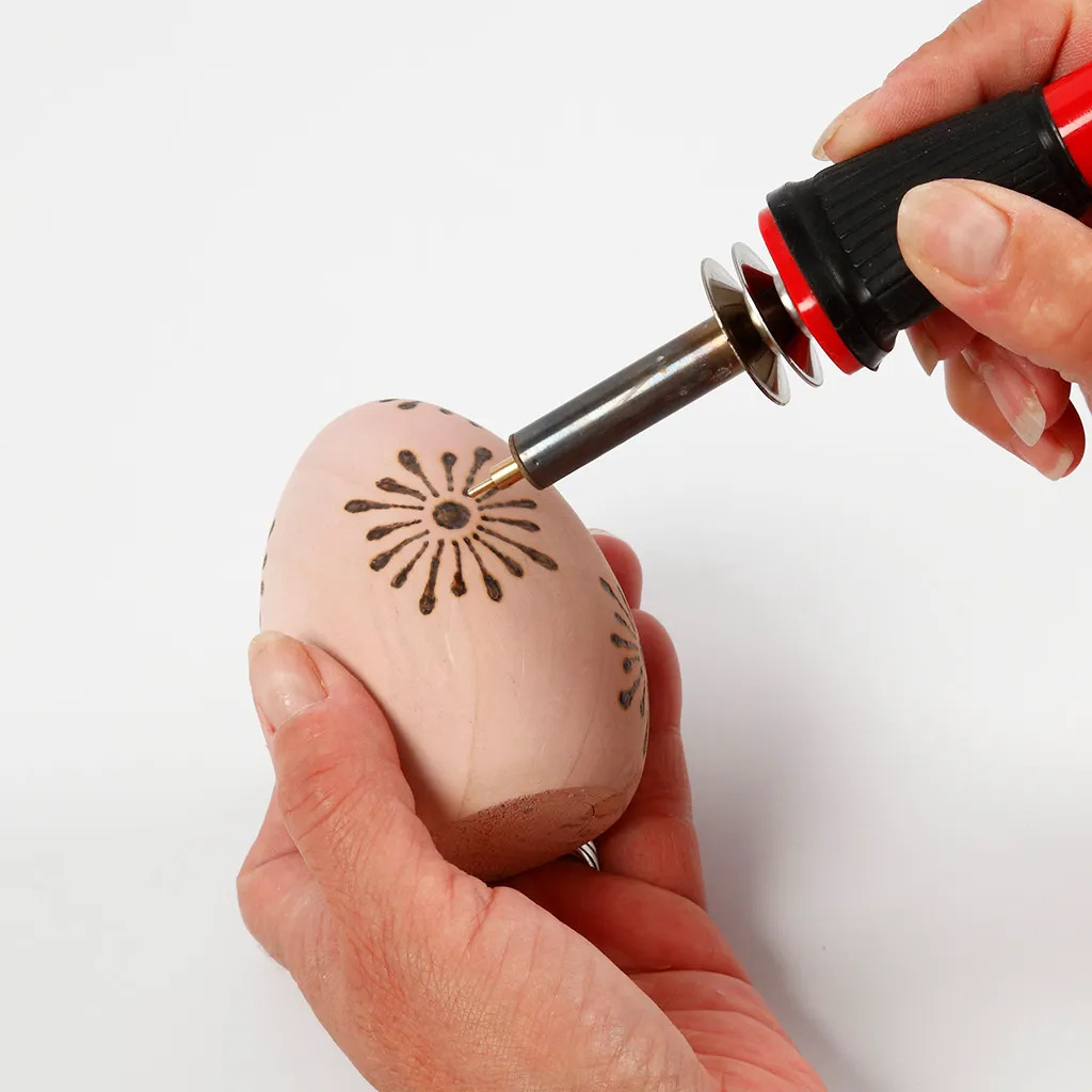 Stap 5Brand het ontwerp in het ei met een houtbrander. Hier hebben we de dunne punt gebruikt.