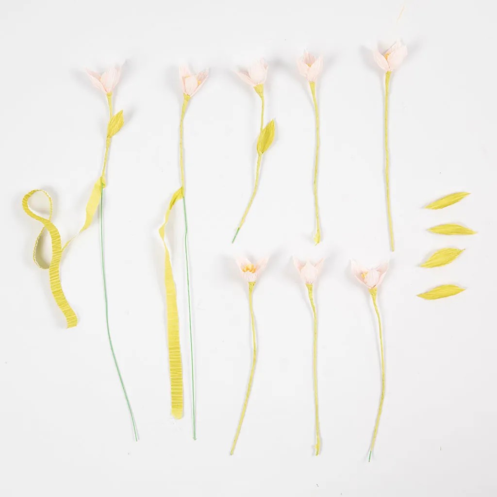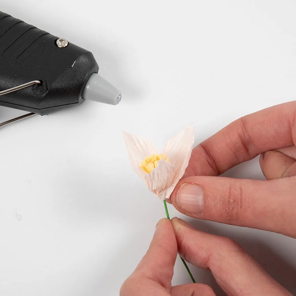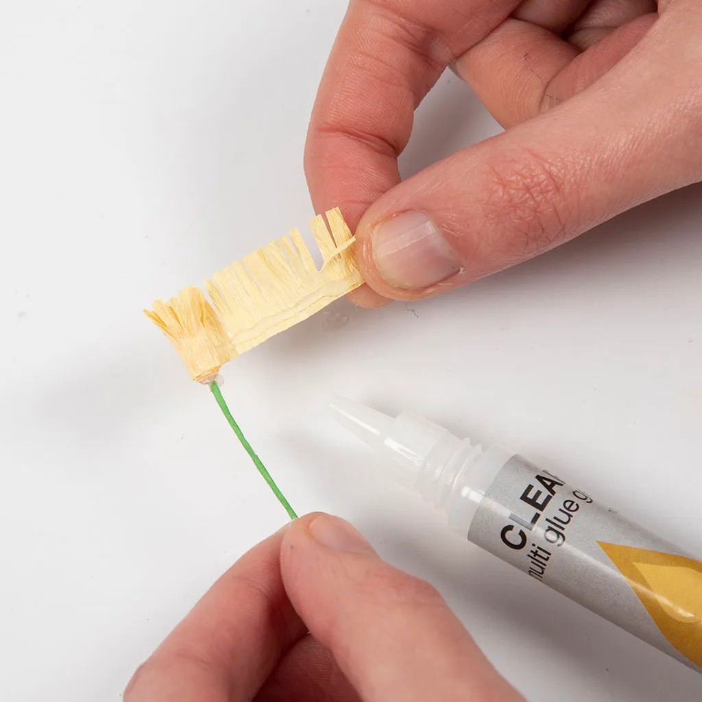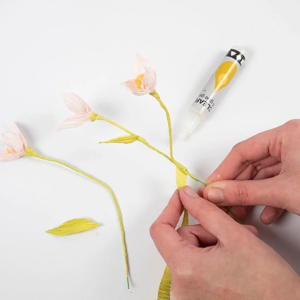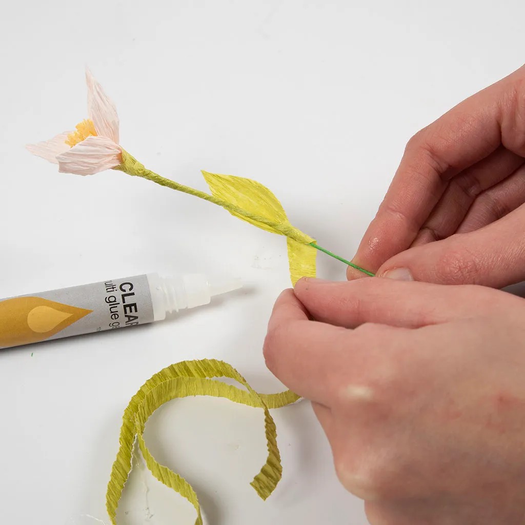 Stap 5Knip een stuk lichtgroen crêpepapier van 1 x 30 cm in de richting van de stretch – vergeet niet om het stuk volledig uit te rekken. Plak één uiteinde van de strook over de onderkant van de blaadjes voor een mooie afwerking. Bedek de steel met het crêpepapier. Draai het diagonaal langs de steel en lijm het vast. Als u wilt, plakt u een klein blaadje op de steel dat u meedraait, zodat het de lijm bedekt.