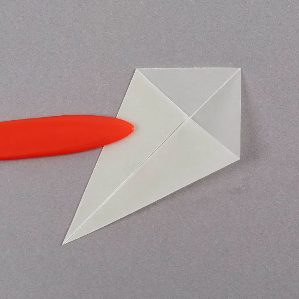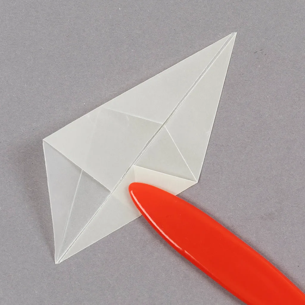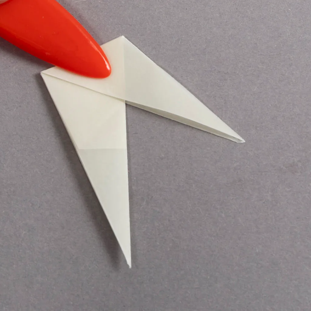 Stap 28Vouw de bovenste driehoek langs de lange zijde omlaag richting het midden.