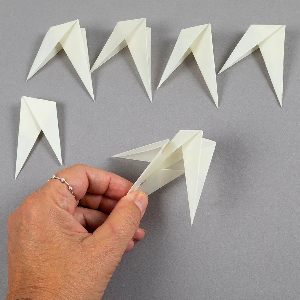 Stap 2Vouw alle zeven stukjes papier één keer dubbel, en doe dit steeds diagonaal.