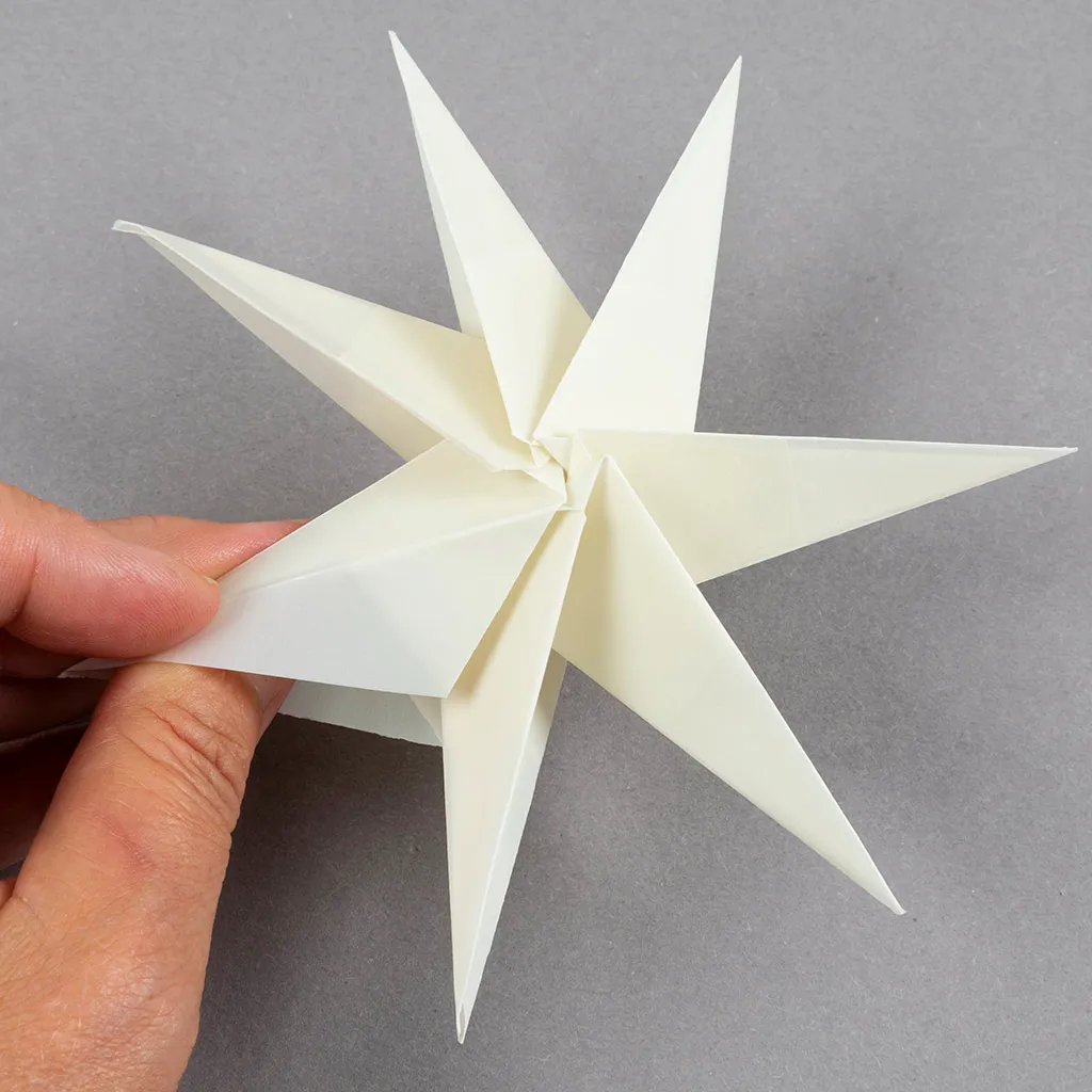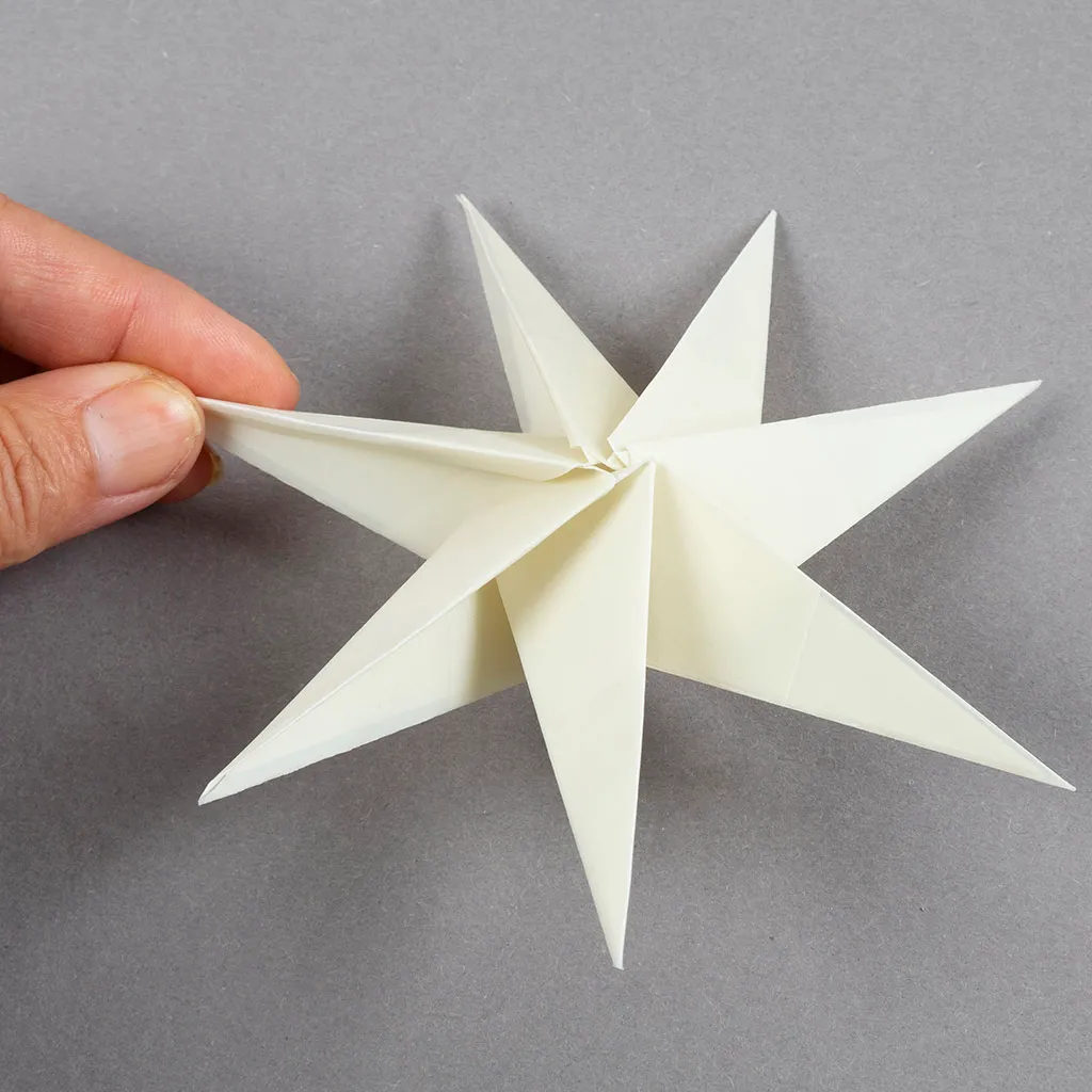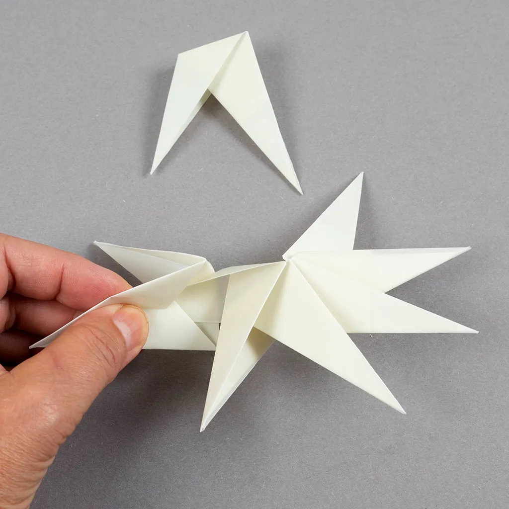 Stap 15Zet de ster nu in elkaar zonder lijm. Schuif de korte punt in de vouw van de lange punt van een ander gevouwen vel.