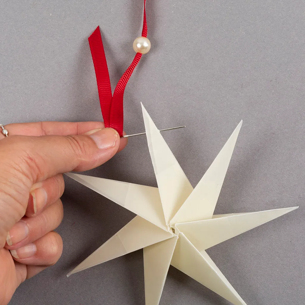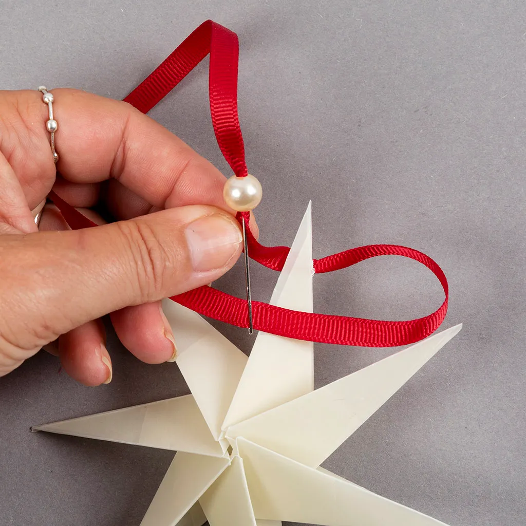 Stap 21Trek aan het lint totdat de kraal net boven de punt van de ster komt te liggen. Knoop daarna de uiteinden van het lint aan elkaar.