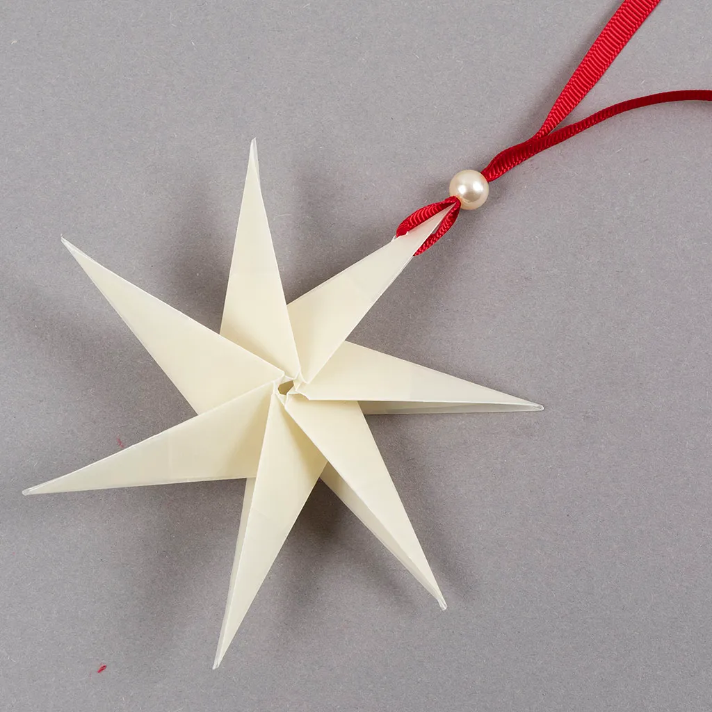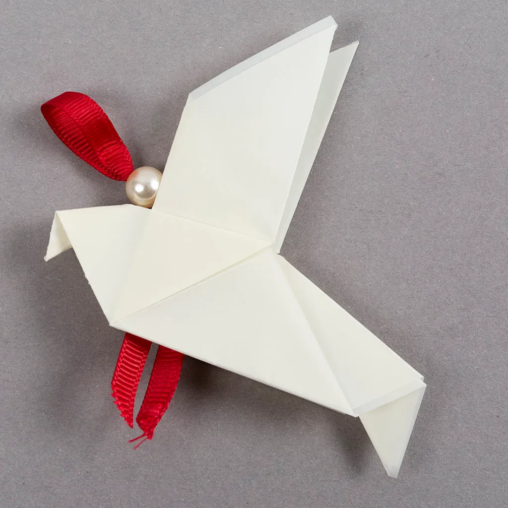 Creëer sfeervolle kerstdecoraties van wit vellum met de elegante vouwkunst origami. Vouw zonder lijm prachtige duiven of sterren en werk ieder ontwerp af met een rood lintje en een parelmoerwitte kraal voor een feestelijke uitstraling.