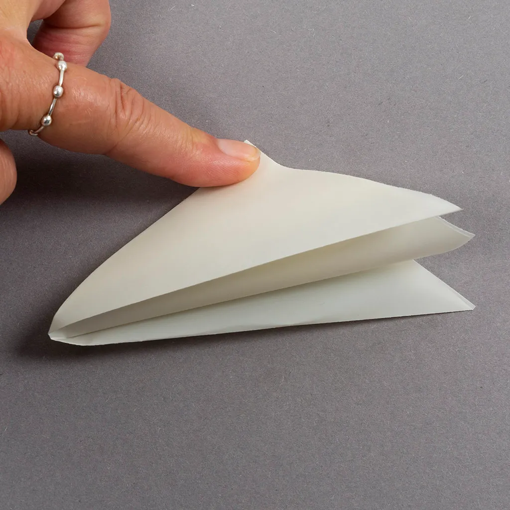 Stap 17Voor het laatste vel open je de gevouwen randen op de lange punt zodat je daar de korte punt kunt inschuiven.
