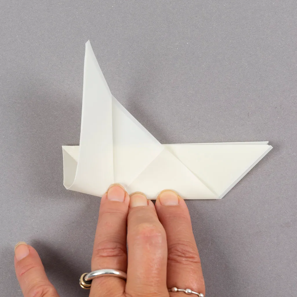 Stap 30Draai het model zodat de lange zijde boven ligt. Vorm vervolgens de vleugel door de bovenste laag omhoog te vouwen. De lijnen van het kleine driehoekje sluiten daarbij netjes aan tegen het lijf.