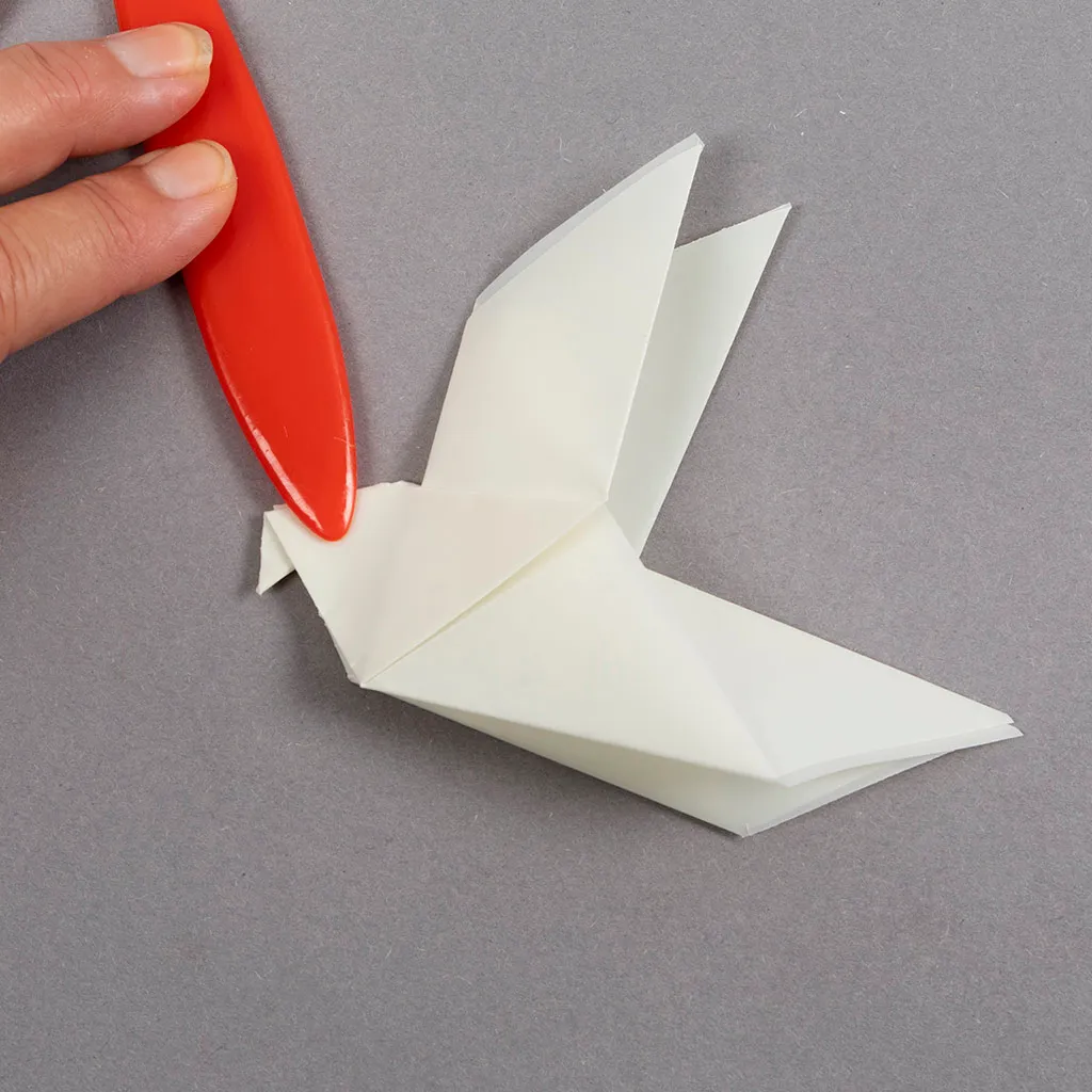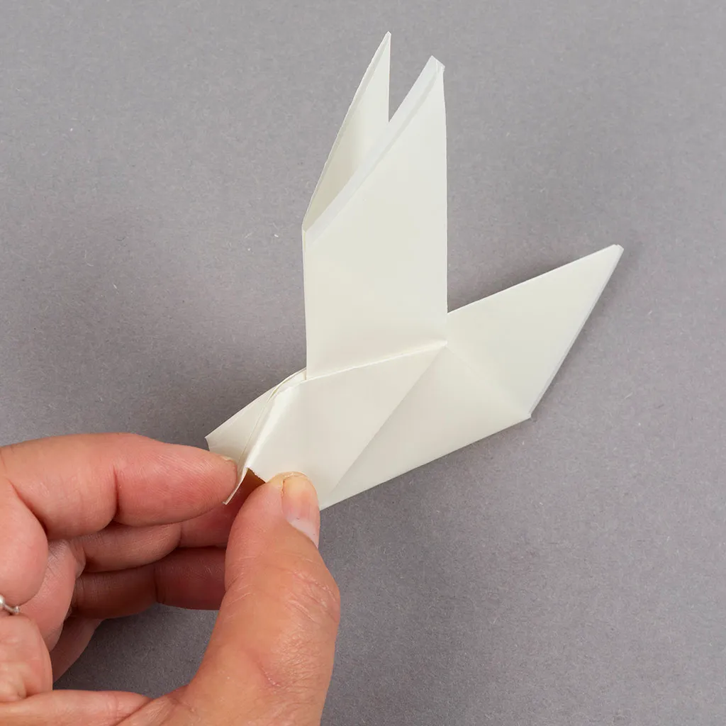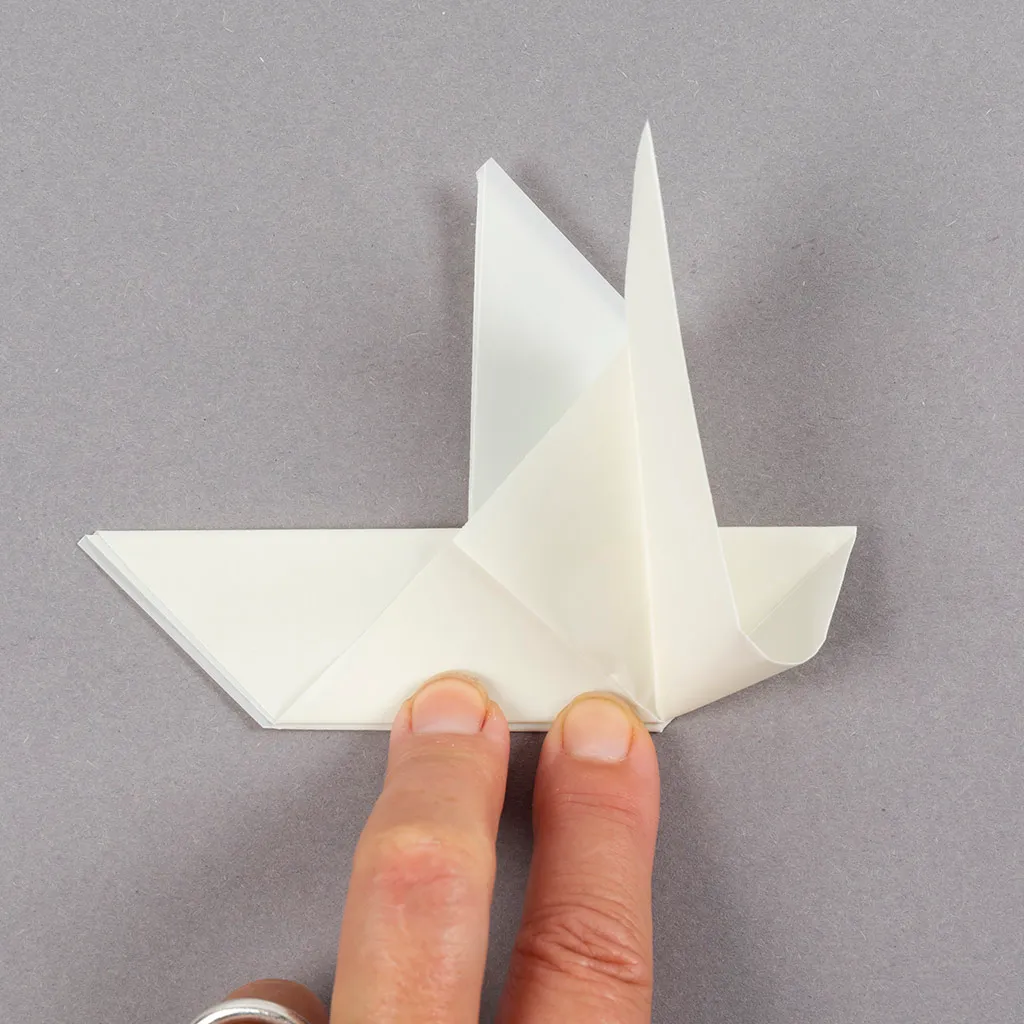 Stap 36Vouw de snavel weer open en plooi deze vervolgens naar binnen, richting het lichaam van de duif, waarbij je de bestaande vouwlijnen volgt.