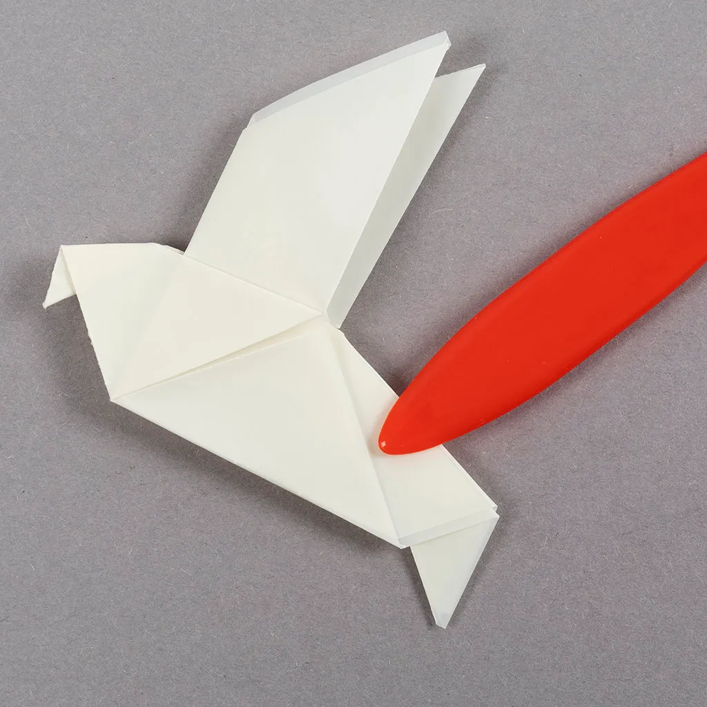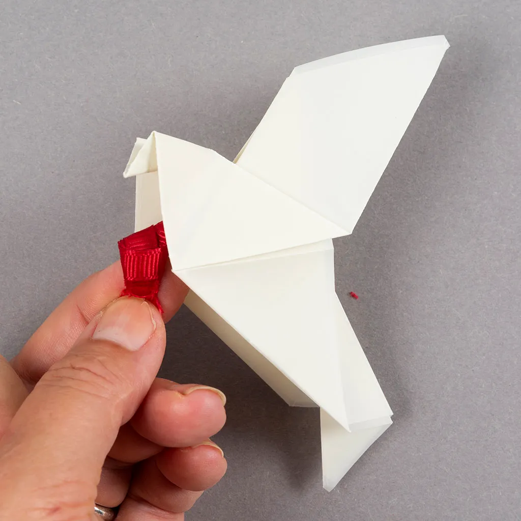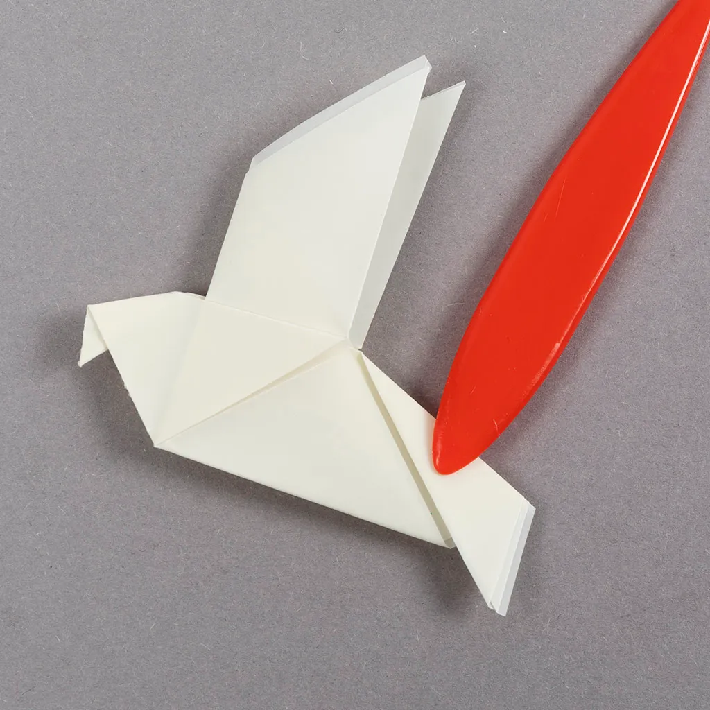 Stap 36Vouw de snavel weer open en plooi deze vervolgens naar binnen, richting het lichaam van de duif, waarbij je de bestaande vouwlijnen volgt.