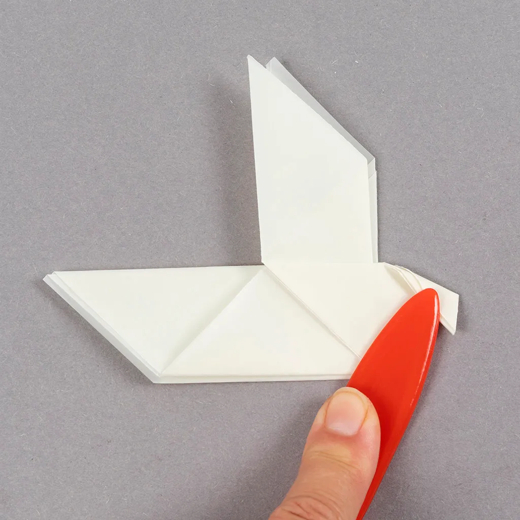 Stap 38Vouw de staart van de vleugel omlaag langs één zijde van de driehoek op het lichaam.