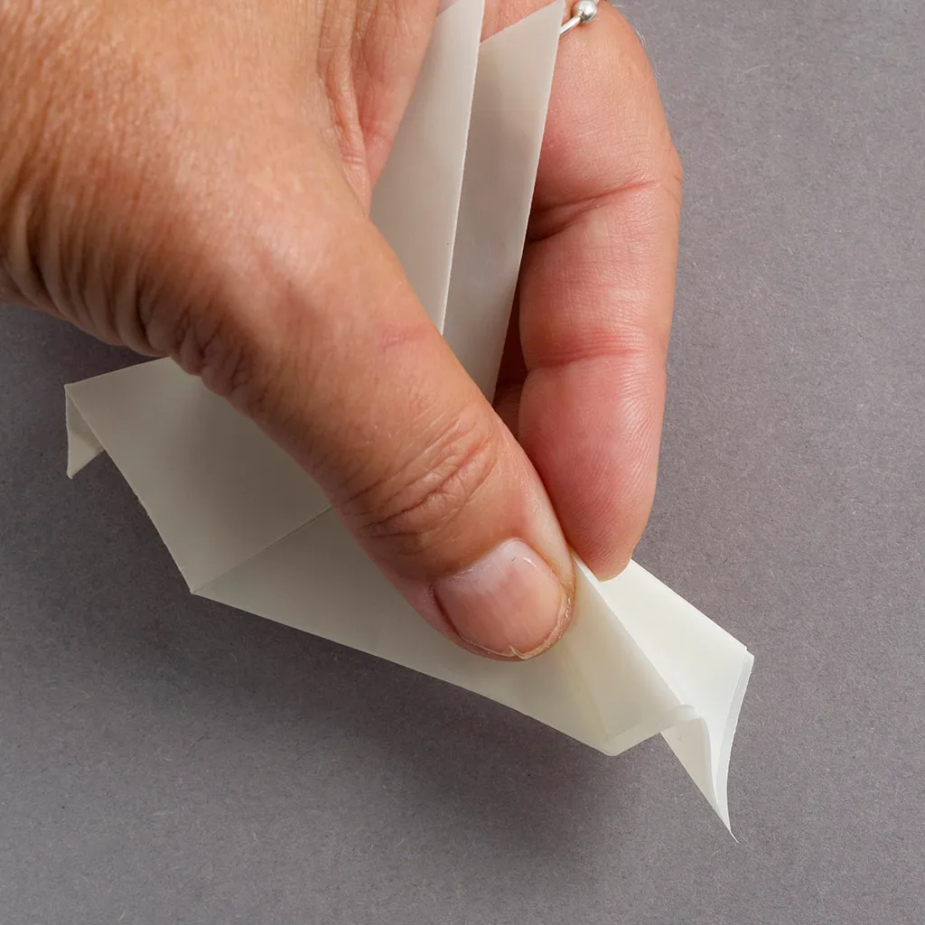 Stap 31Breng op de bovenste papierlaag een vouw aan langs de rand van het kleine driehoekje dat tegen het lichaam ligt.