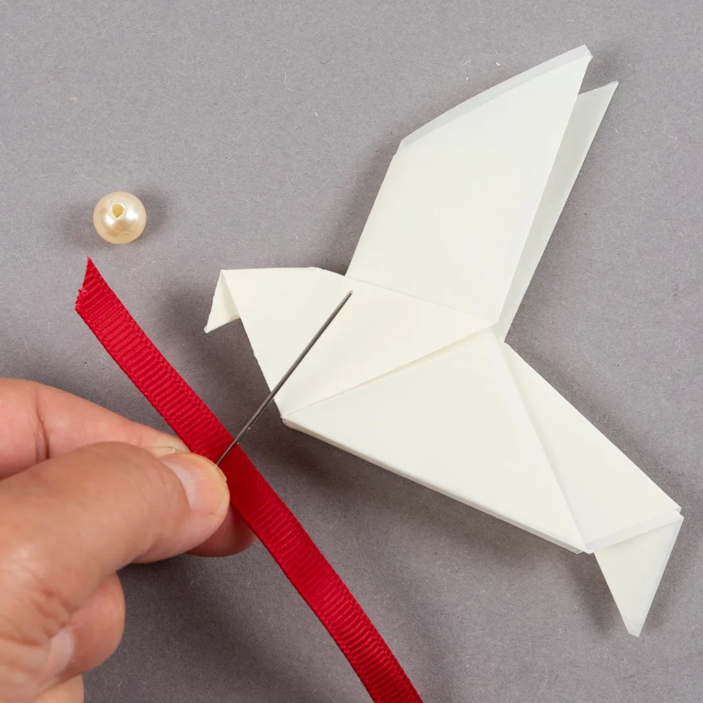 Stap 41Knip een lint van 20 cm om de duif op te hangen en rijg het door een naald. Steek de naald vervolgens van onder naar boven door de rug van de vogel.