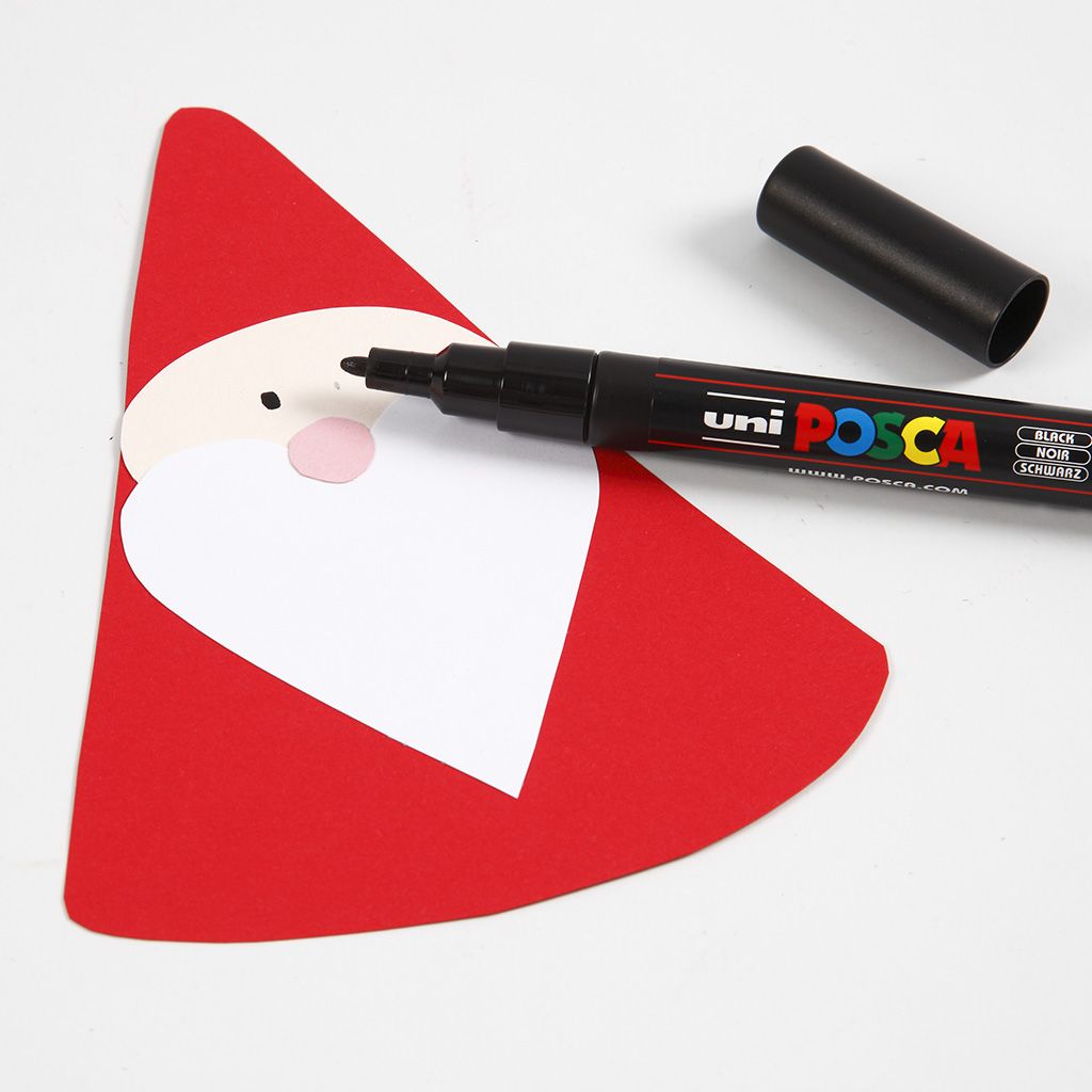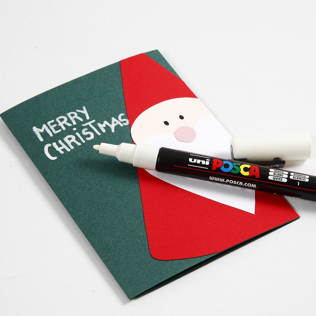1Deze kerstkaarten (met envelop) zijn versierd met opgeplakte kerstfiguren van karton. De tekst is toegevoegd met een Uni Posca-stift.