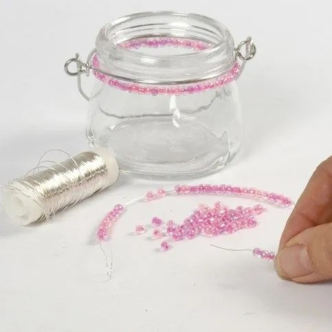 Stap 1Rijg rocailles of andere kleine kraaltjes aan een dun stuk alu draad, deze is om de rand van de glazen lantaarn geknoopt.