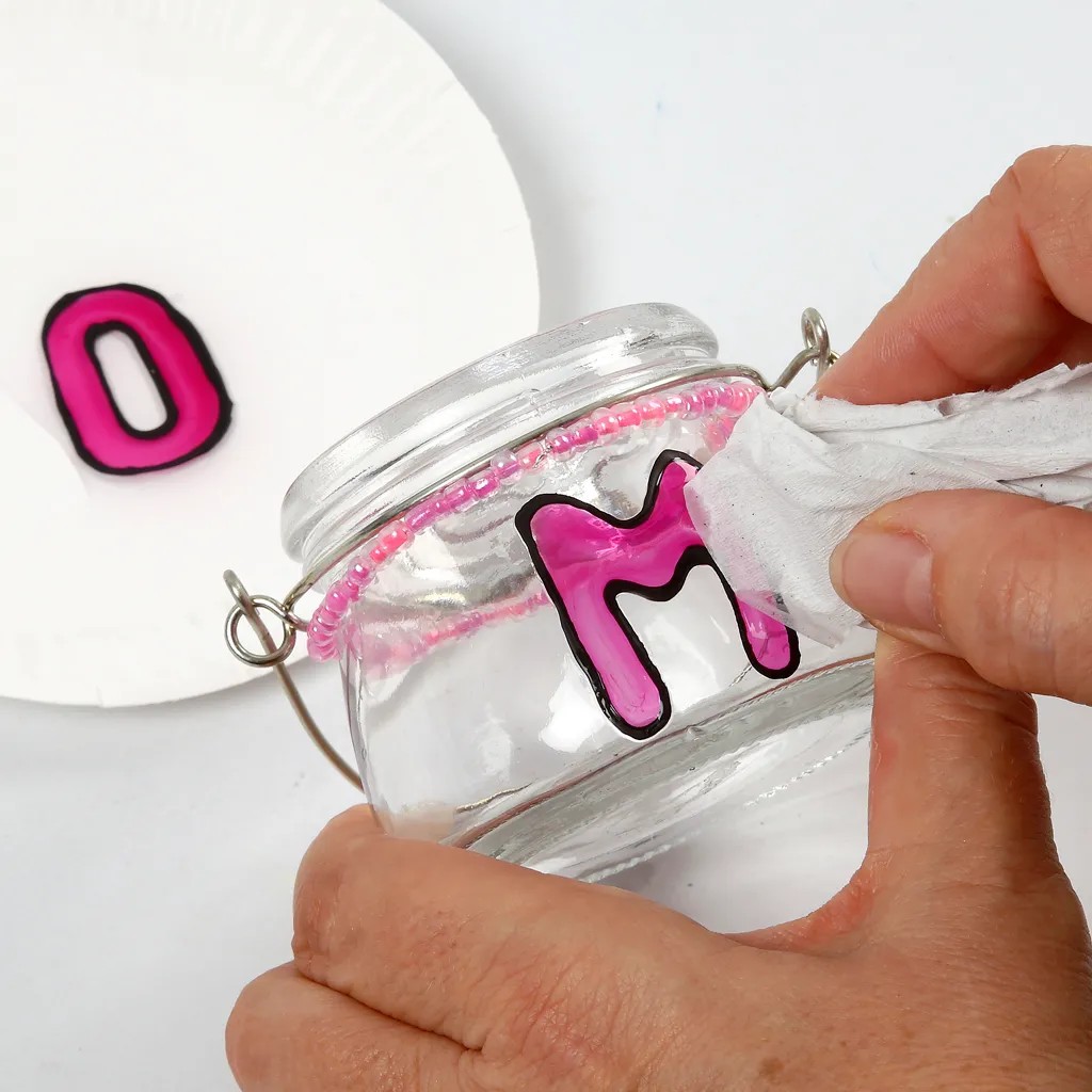 Stap 4Verwijder voorzichtig het ontwerp of de tekst van de folie, bevochtig dit en plaats het op de glazen lantaarn.
