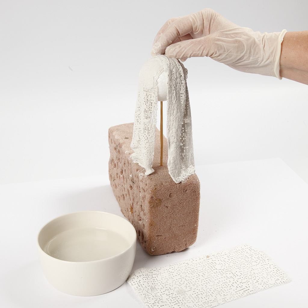 Knip gipsgaas in repen en maak die vochtig met water. Drapeer het gipsgaas over de styropor bal in lagen. Laat drogen