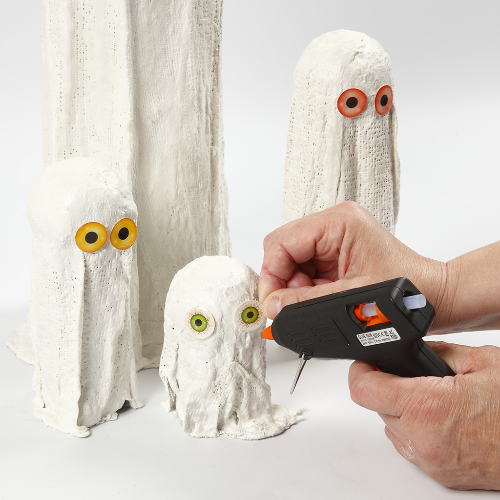 Stap 3Lijm de wiebelogen op het spook met een lijmpistool.