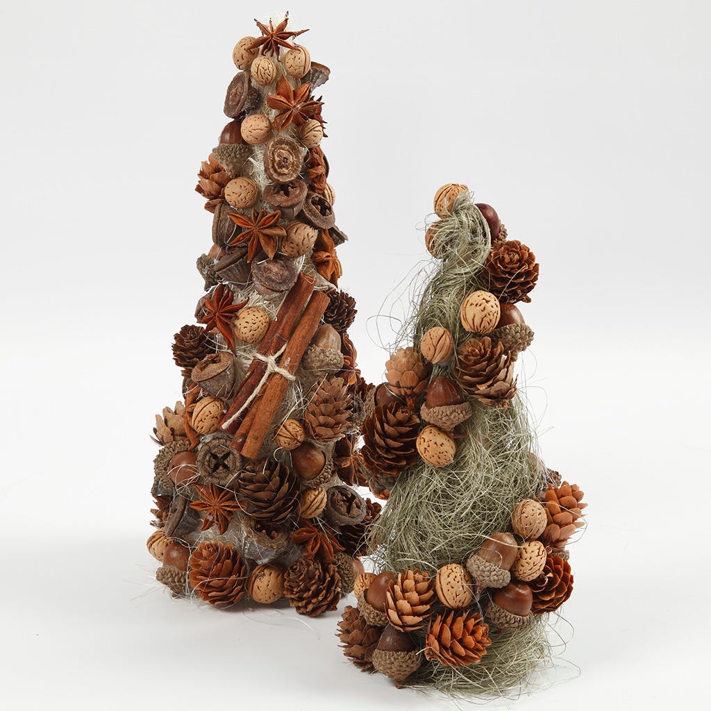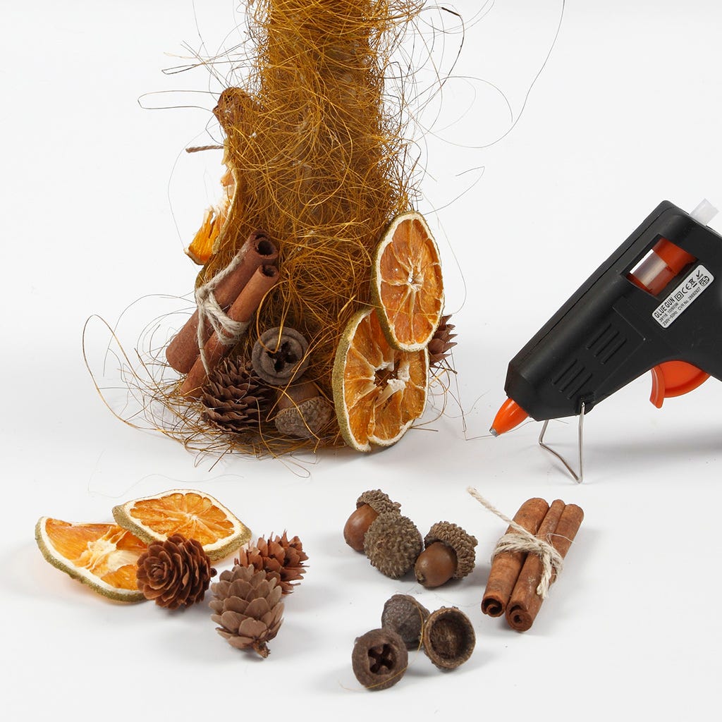 Versier een kegel van papier-maché met sisal en gedroogde natuurlijke materialen bevestigd met een lijmpistool.