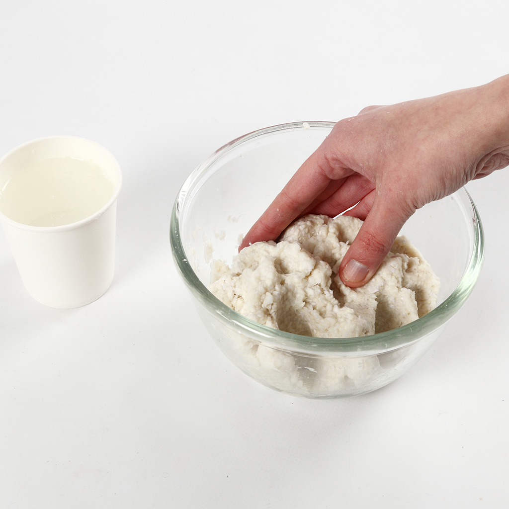 1Meng papier-machépulp met water in een verhouding van 3 op 1: drie delen pulp op één deel water.