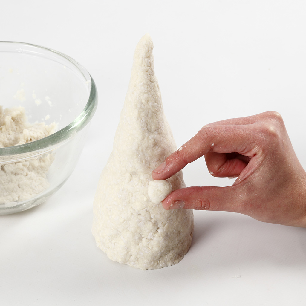 4Neem een kleine hoeveelheid pulp, knijp deze samen en rol er voorzichtig een rond neusje van. Druk het vervolgens op de natte pulp vast.