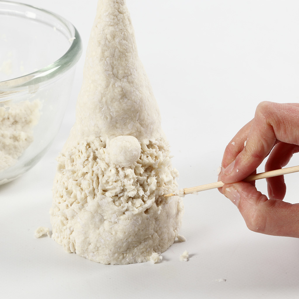 5Breng structuur aan in de natte pulp met je vingers of met verschillende gereedschappen. In dit voorbeeld is een bloemstokje gebruikt om de baard textuur te geven. Laat het geheel 1–3 dagen drogen, afhankelijk van de dikte van het papier-maché.