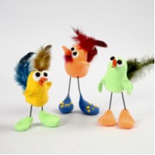 Deze kippen met voeten zijn gemaakt van Silk Clay met poten van ijzerdraad. Gedecoreerd met veertjes.