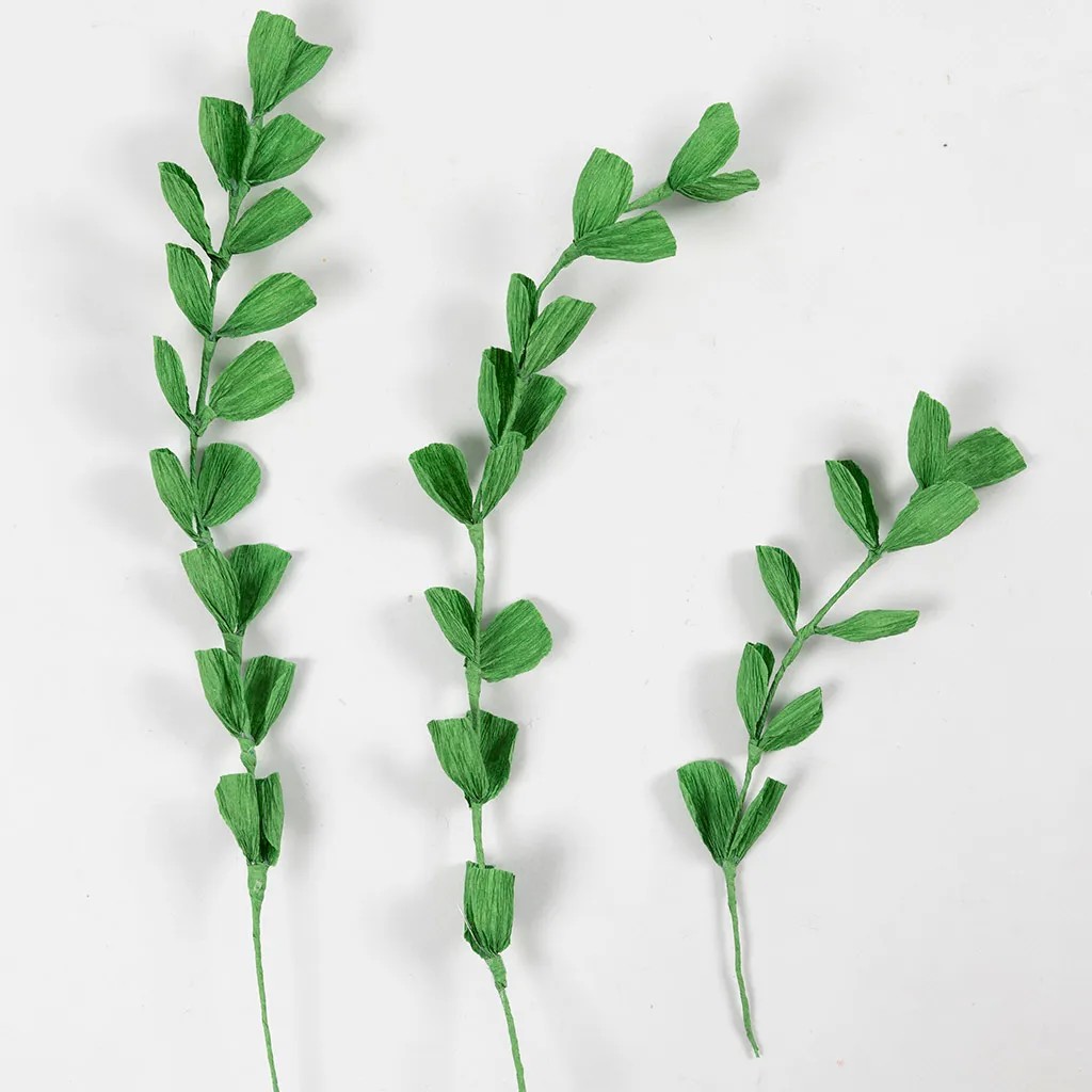 Maak uw eigen takken van crêpepapier. Elke tak heeft 18 kleine blaadjes, maar u kunt dit aantal naar wens aanpassen. Gebruik een lijmpistool of transparante hobby om de onderdelen aan elkaar te plakken.