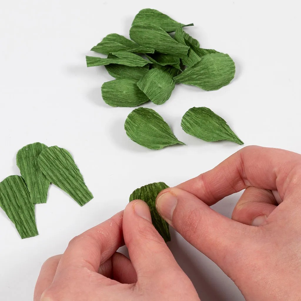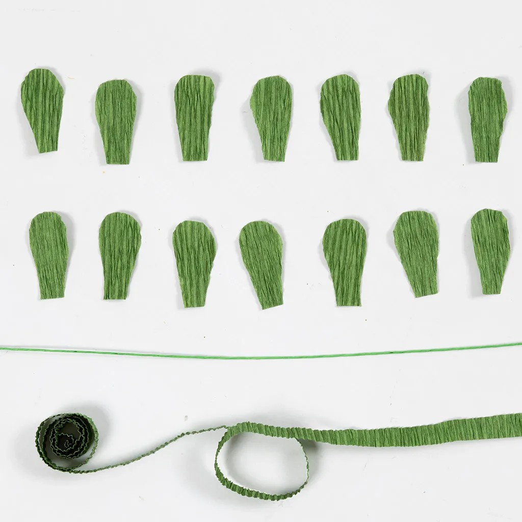 Stap 1Druk het sjabloon af, dat u als aparte pdf op deze pagina kunt terugvinden. Snijd de stukken uit volgens het sjabloonvel – zowel de bladeren als een lang afdekdeel. Vergeet niet te snijden in de richting van de rek van het crêpepapier.
