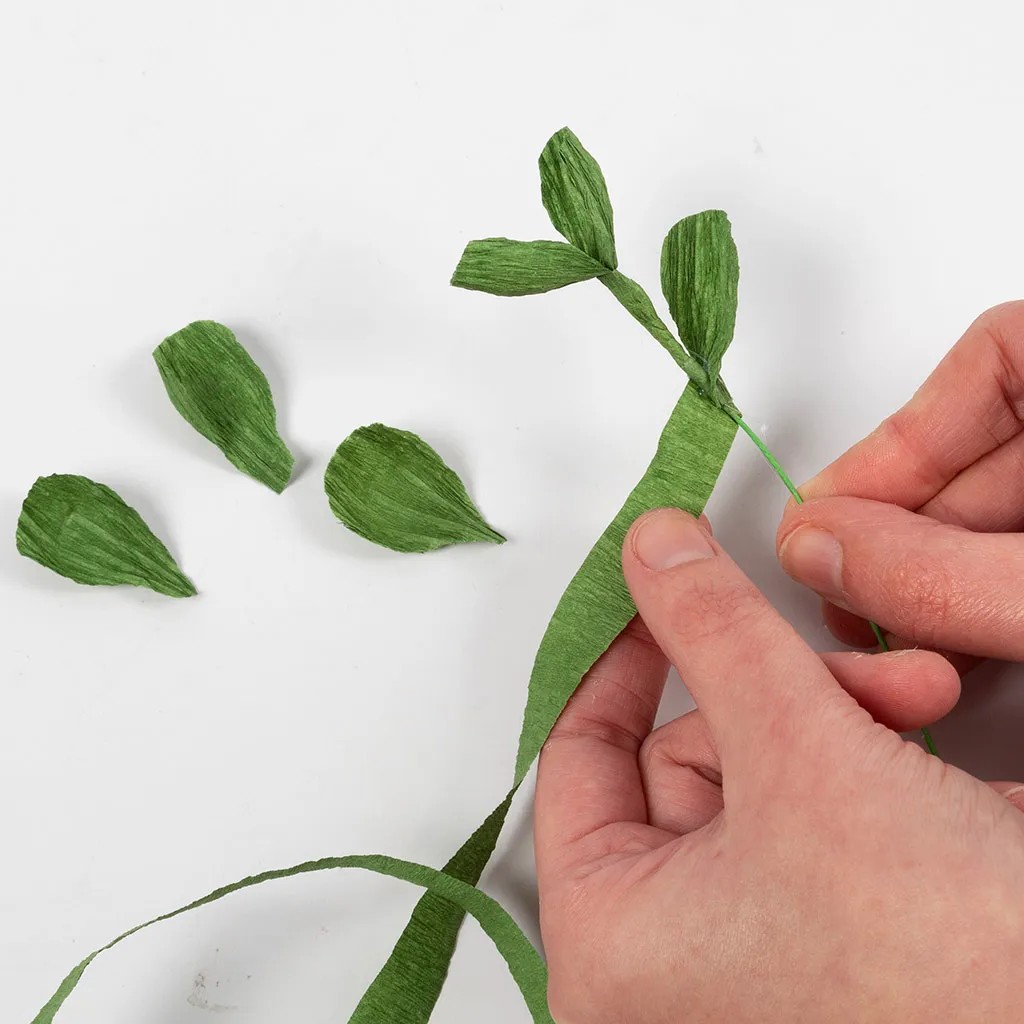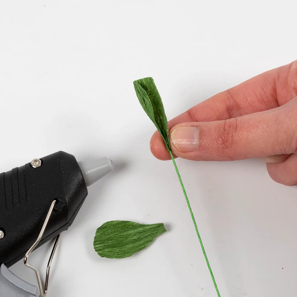 Stap 4Bedek de steel en begin bovenaan waar de eerste twee blaadjes zijn vastgelijmd. Rol de strook diagonaal over het steeltje en plak hem er stevig op met Multi Glue. Plaats een nieuw blad op ongeveer 1-2 cm van de bovenste bladeren en lijm het direct op de steel met een lijmpistool. Wikkel het stukje diagonaal om de steel en bedek het uiteinde van het blaadje met de strook. Ga door tot de steel volledig bedekt is.