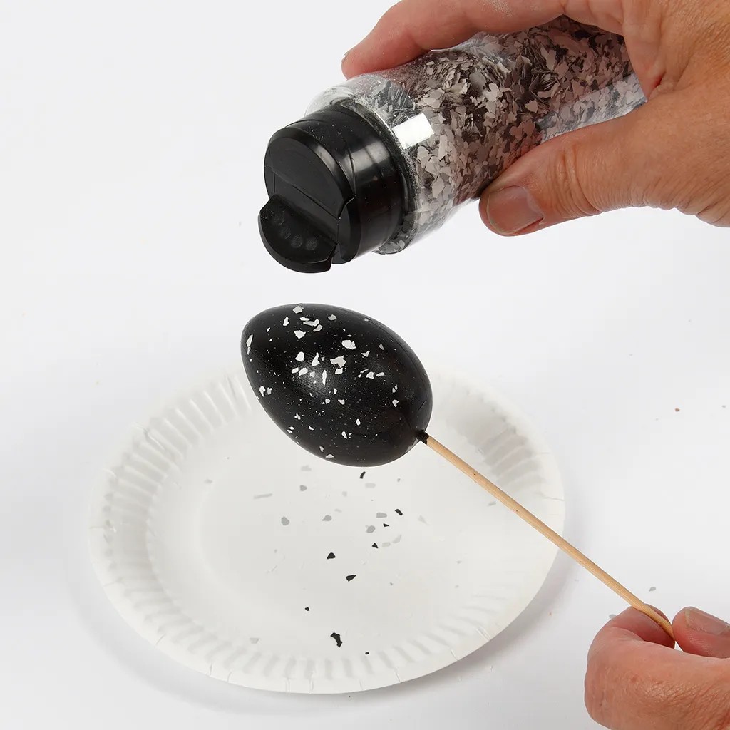Moderne eieren gedecoreerd met terazzo vlokken.De basis is gedaan met onze bekende en favoriete Plus Color acrylverf.