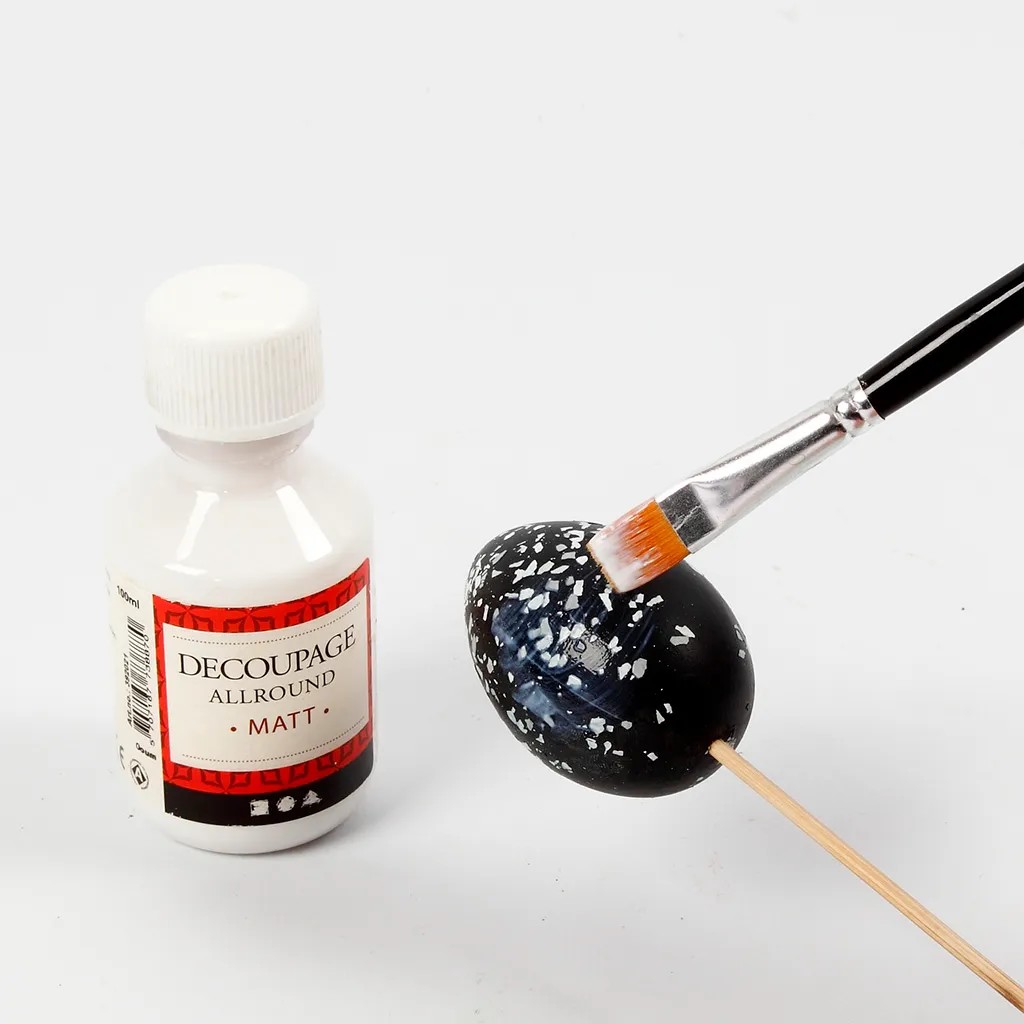 Om nu de eitjes te beschermen tegen beschadigingen adviseren we je nog een laagje decoupagelijm op het eitje aan te brengen.