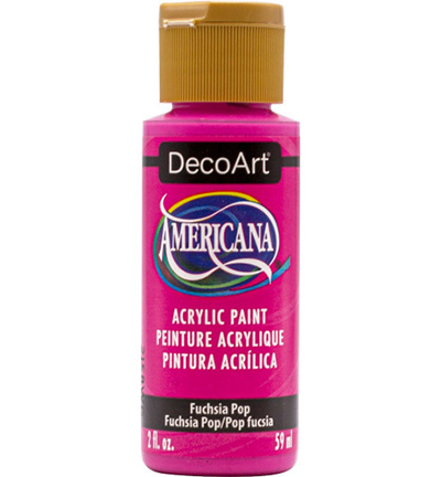 Fuchsia Pop is een krachtige fuchsiaroze kleur met maximale impact, Americana Acrylics is een watergedragen acrylverf met matte afwerking en een medium body, geschikt voor decoratief schilderwerk en creatieve projecten,
