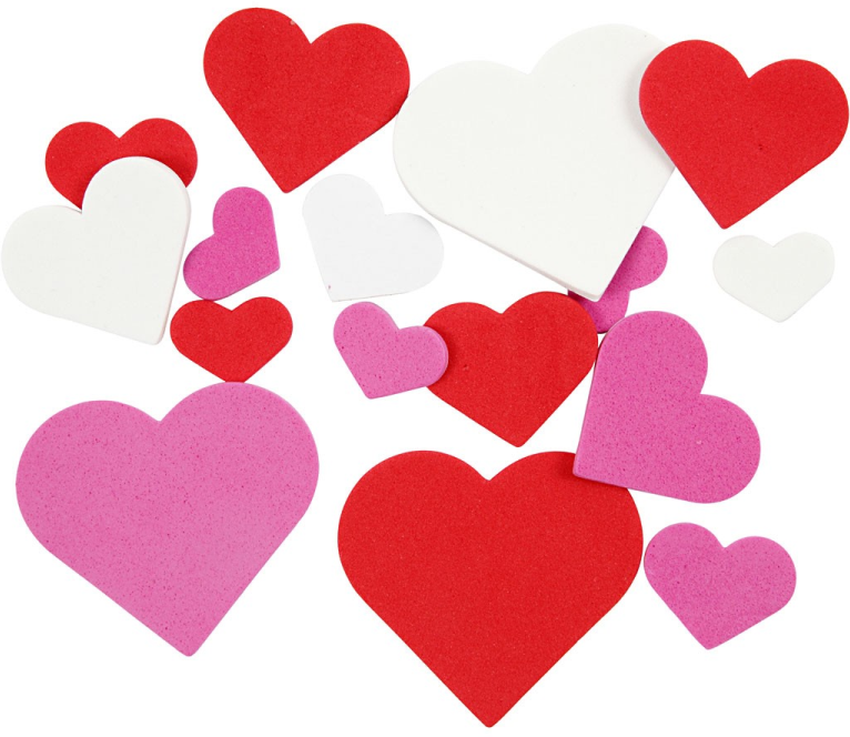 Romantische foam harten in meerdere formaten en kleuren. Perfect voor kaarten, traktaties en Valentijn‑ of trouwdecoraties.