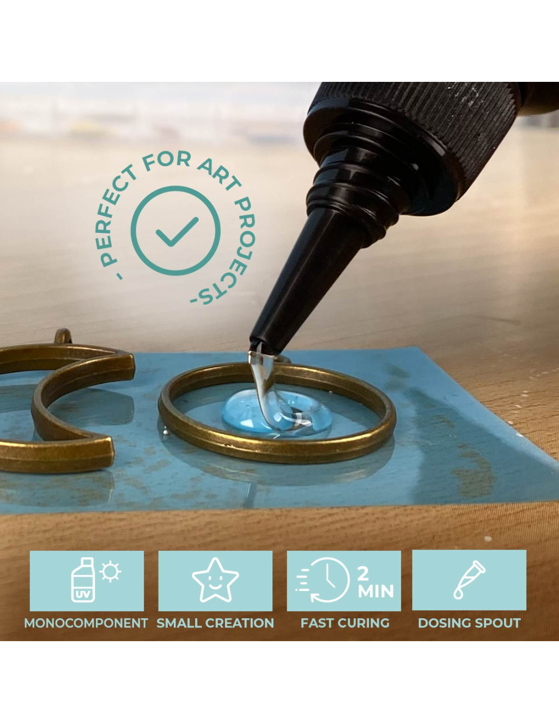 Fil Cristal UV is een monocomponente epoxyhars die uithardt onder UV-licht, Geen mengen nodig: doseer direct in je mal of op een sieraadsetting en hard uit met UV,