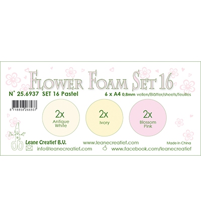 Flower Foam set 16, 6 vellen A4 3×2 Pastel 1. is een veelzijdig foam voor bloem- en hobbyprojecten. Het is licht, flexibel en eenvoudig te vormen met warmte. Perfect voor natuurgetrouwe bloemen, decorstukken en creatieve accessoires – van miniaturen tot cosplay.