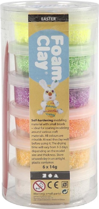 De Foam Clay Spring Colours set bevat 6 potjes van 14 gram in frisse voorjaarskleuren. Perfect voor lenteprojecten, bloemen, paasdecoraties en vrolijke kinderknutsels. Foam Clay is een kneedbare klei met bolletjesstructuur die zonder lijm hecht op piepschuim (EPS), hout, karton en papier-maché. Na droging blijft het resultaat licht en stevig.