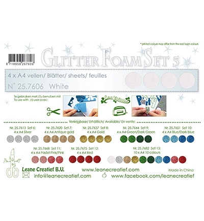 Met deze set van 4 witte glitterfoam vellen heb je een frisse en neutrale basis die toch sprankelt. Licht en flexibel, ideaal voor creatieve projecten waarbij helderheid en glans centraal staan.
