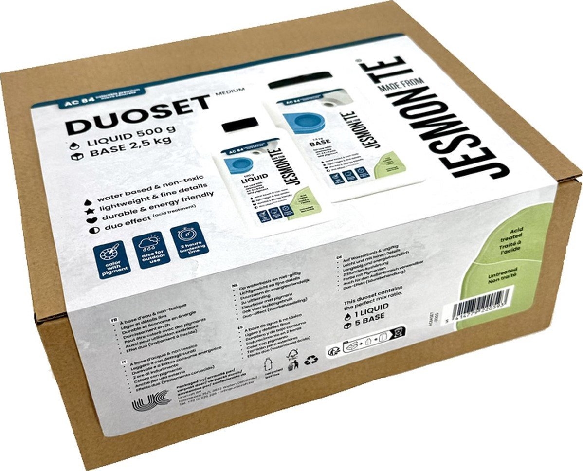 Ontdek de uitgebreide mogelijkheden van Jesmonite AC84, een innovatief gietmateriaal dat de beste eigenschappen van eerdere Jesmonite-producten combineert en nieuwe toepassingen biedt. Deze set bevat 500 ml vloeistof en 2500 gram basispoeder, ideaal voor diverse kunst- en designprojecten.