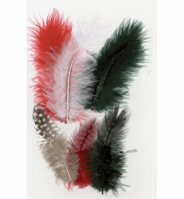 - Set van 18 veren (6 x 3 stuks) in rood, wit en groen